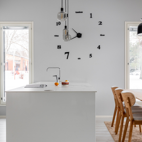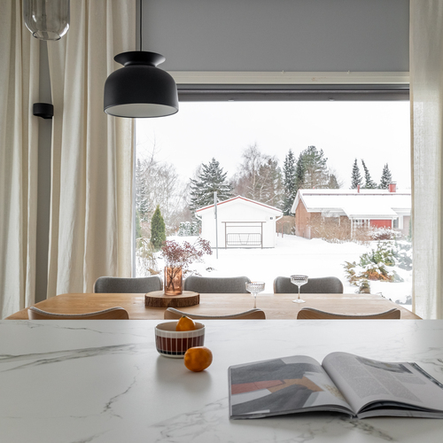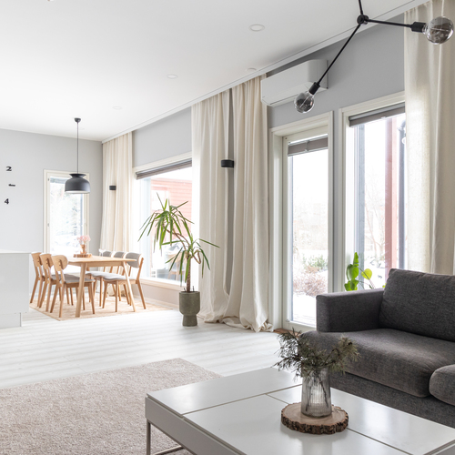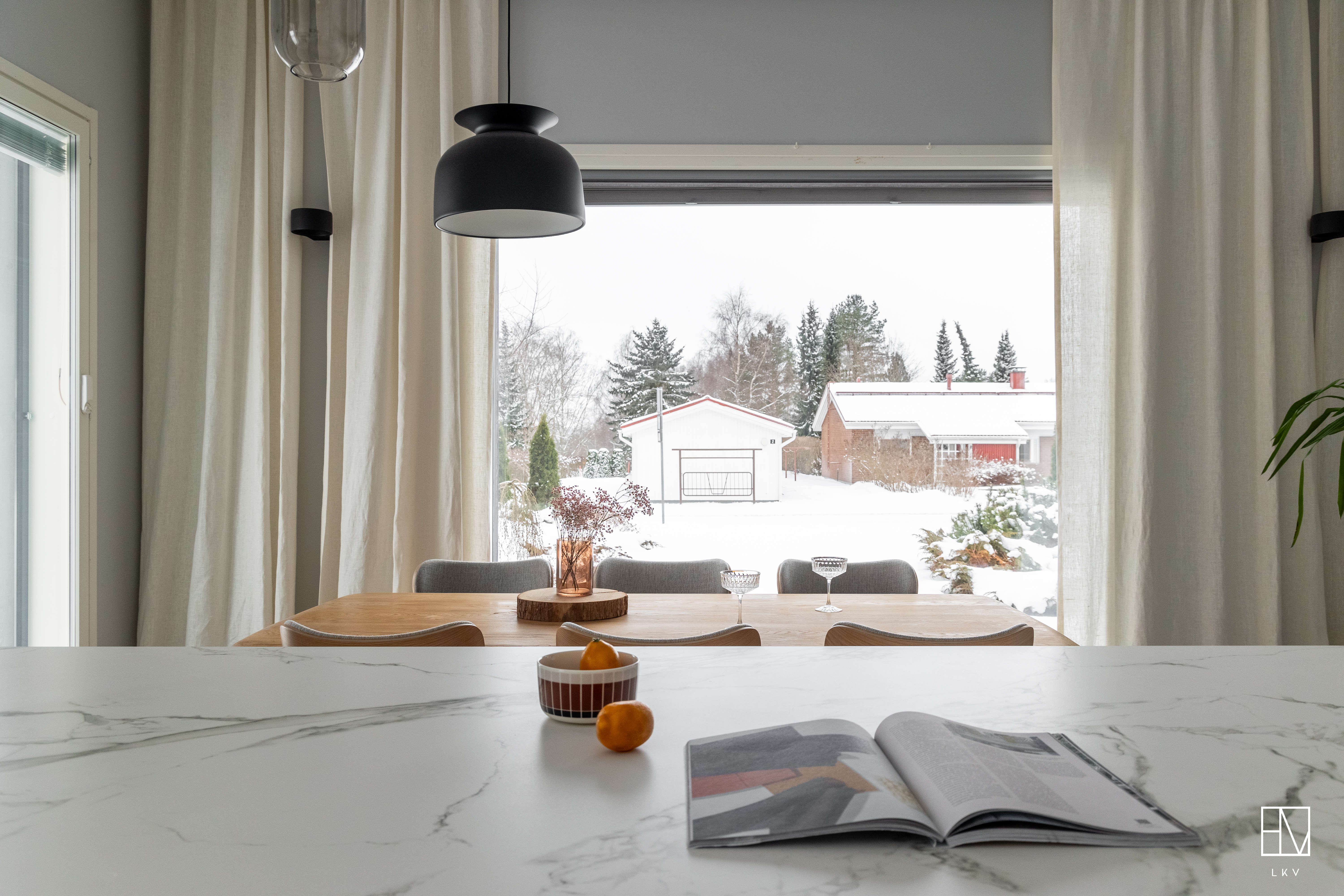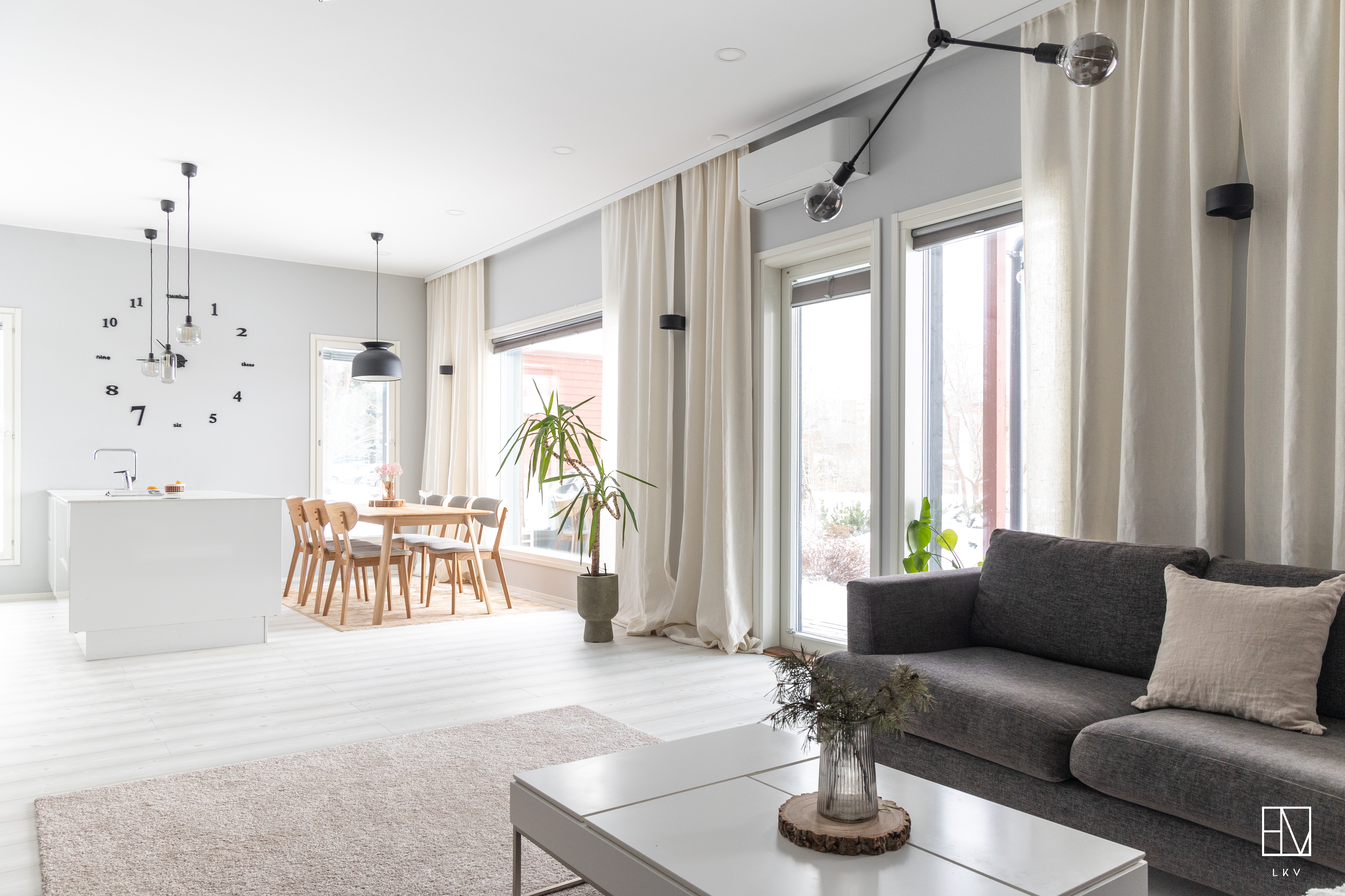 Poikkeuksellisen tilava olohuone ja keittiö ovat samaa avaraa tilaa. Olohuoneesta on käynti tilavalle aurinkoiselle takapihalle ja terassille. Keittiö täyttää vaativankin kokkailijan vaatimukset. Integroidut kodinkoneet, suuri saareke ja Dekton-tasot täydentävät kokonaisuuden. Ilmalämpöpumppu asennettu kesäpäiviä viilentämään.