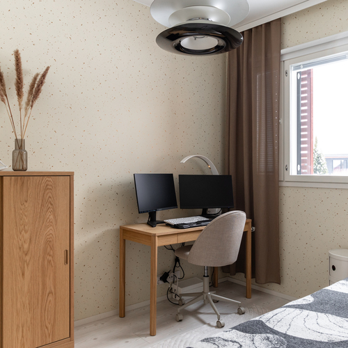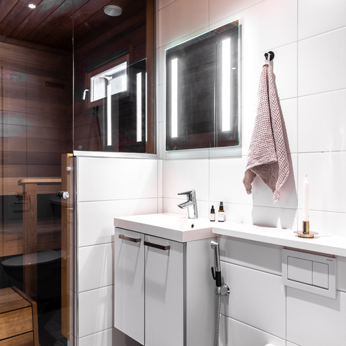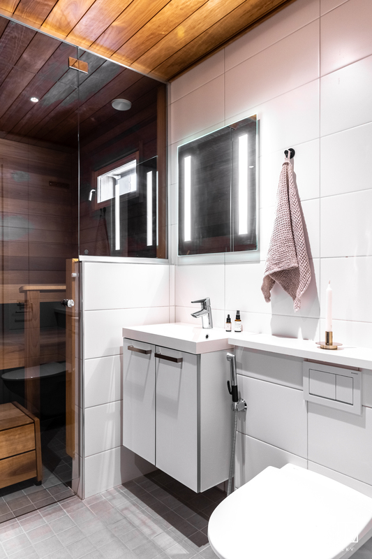 Makuuhuoneiden yhteydessä on kaapistot. Myös eteisessä on kaappitilaa ja tilaa pukeutumiselle. Asunnon toinen wc on oma erillinen tilansa. Toinen wc löytyy kylpyhuoneesta. Tyylikkäässä saunassa lasiseinä. Tilava kodinhoitohuone auttaa arjen pyörittämisessä. Asunnon ulko-oven yhteydessä on oma lämmin ulkovarasto.