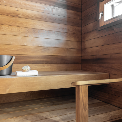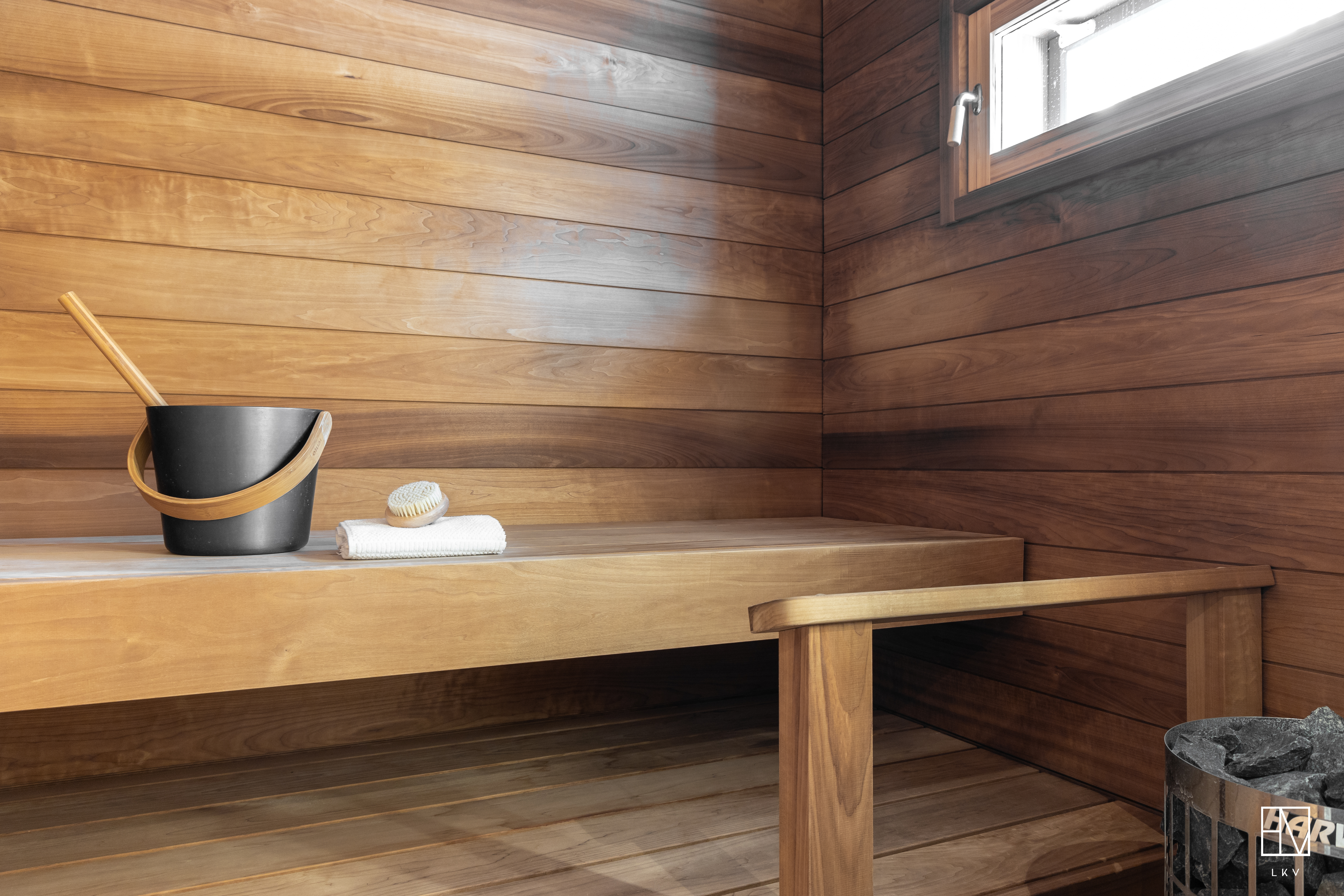 Omassa saunassa pilarisähkökiuas sekä lasiseinä. Lattia laattaa.