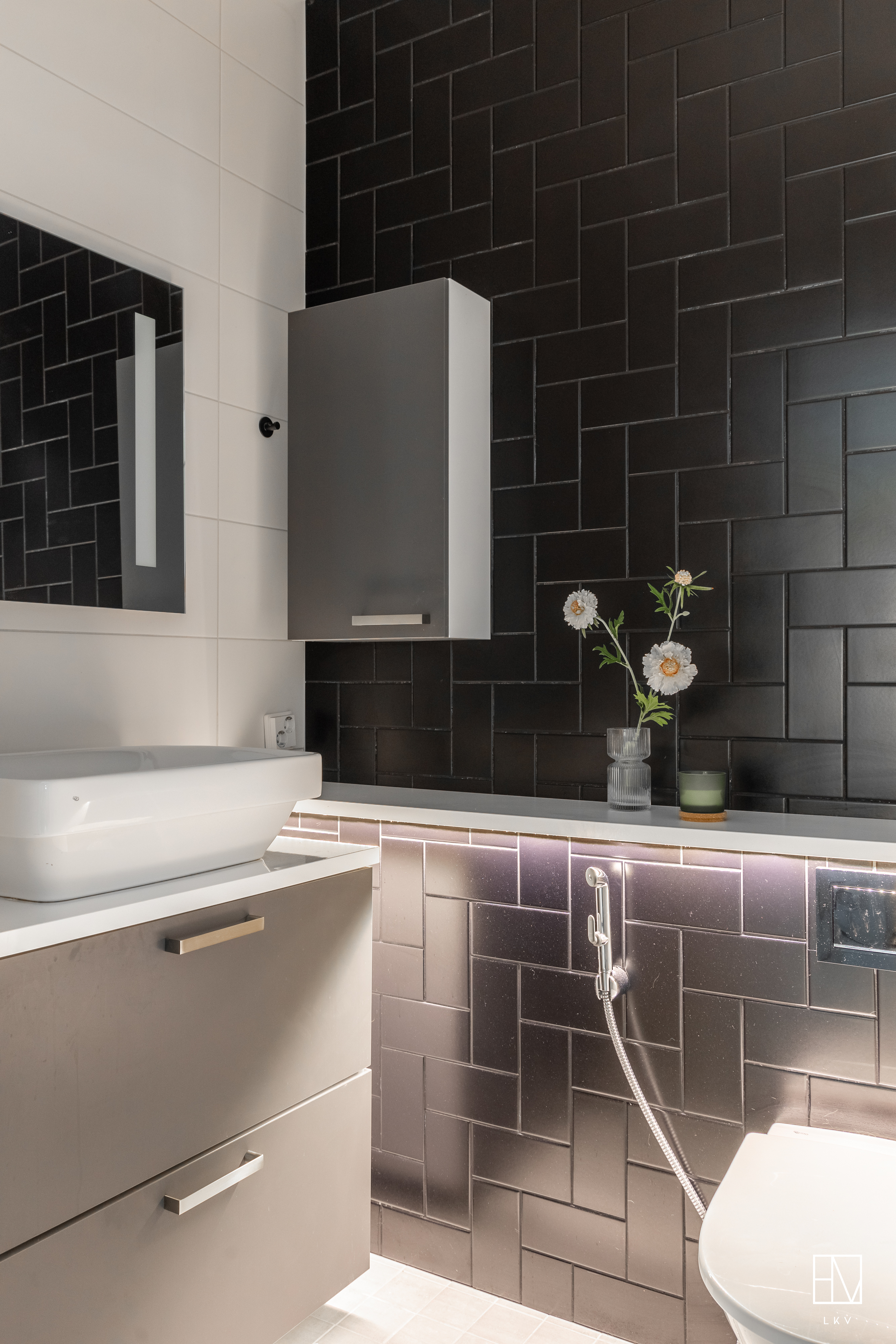 Asunnon toinen wc on oma erillinen tilansa. Seinät ja lattia laattaa. Seinäwc, allaskaappi, malja-allas ja bidee.