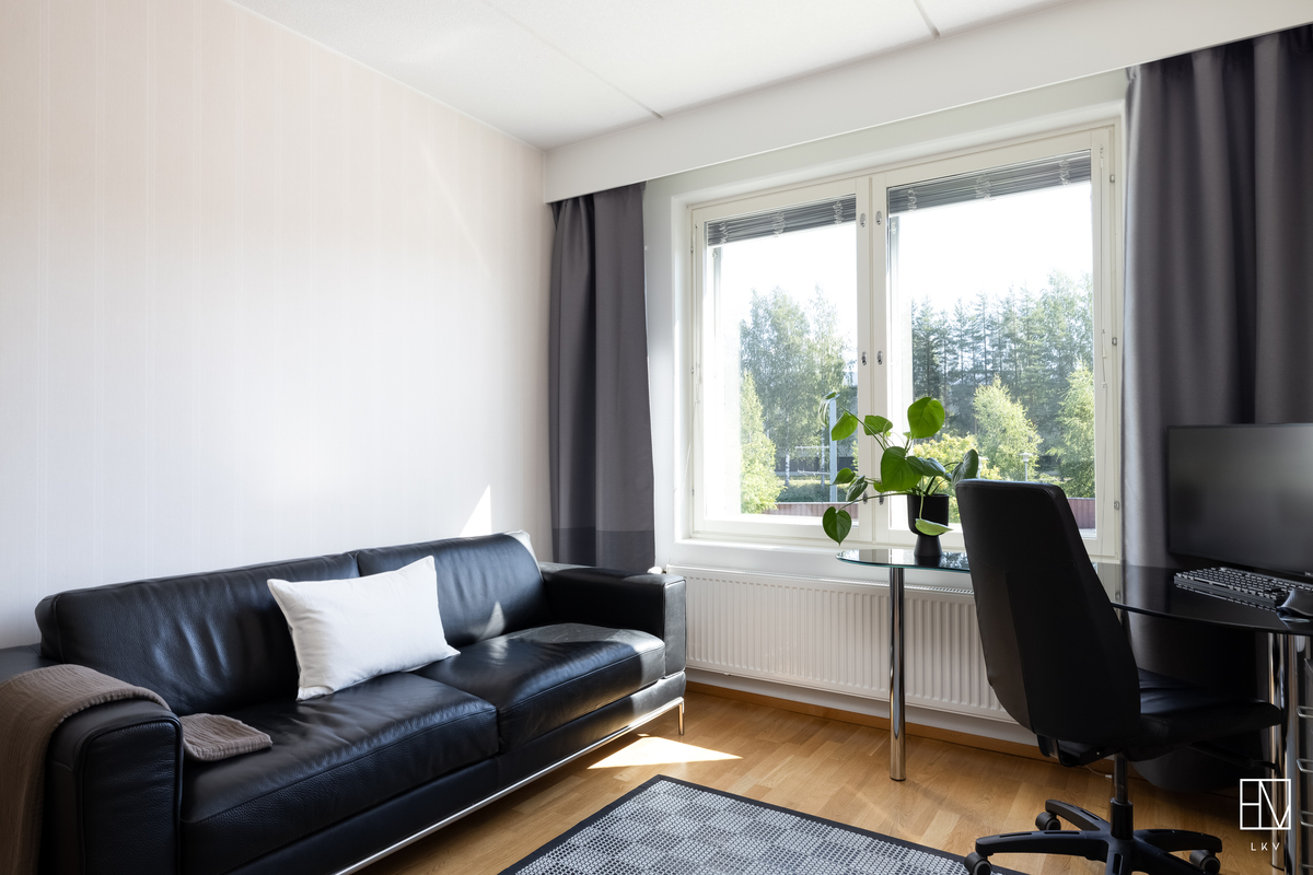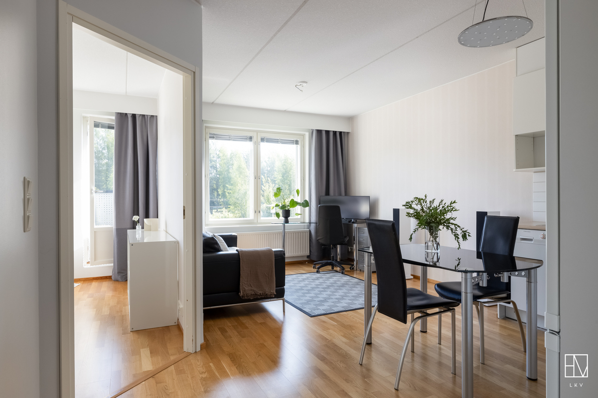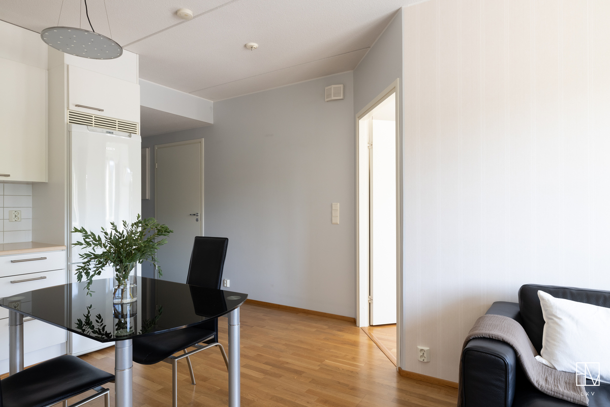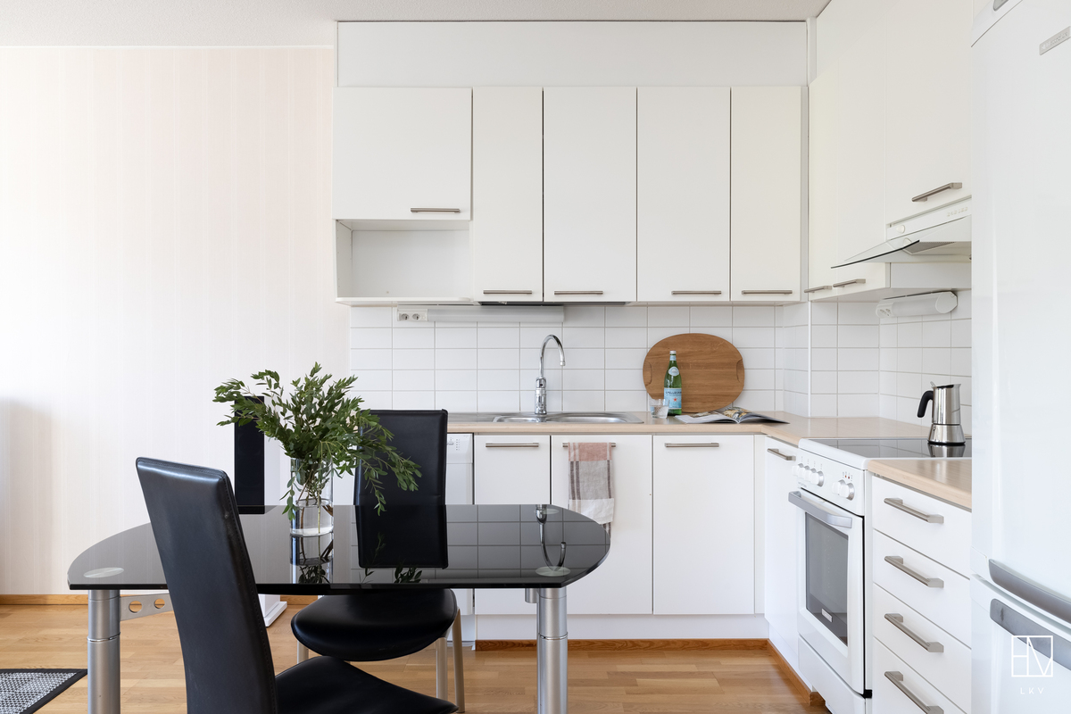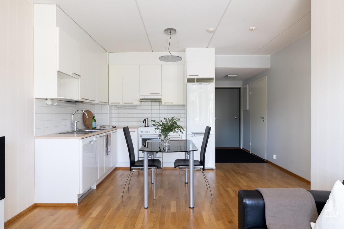 Avara ja toimiva pohjaratkaisu takaavat asuinmukavuuden. Kodin vaalea ja raikas sävymaailma, sekä kauniit parkettilattiat luovat ajattoman kokonaisuuden, jossa olohuone ja avokeittiö yhdistyvät viihtyisäksi yhtenäiseksi tilaksi.