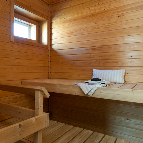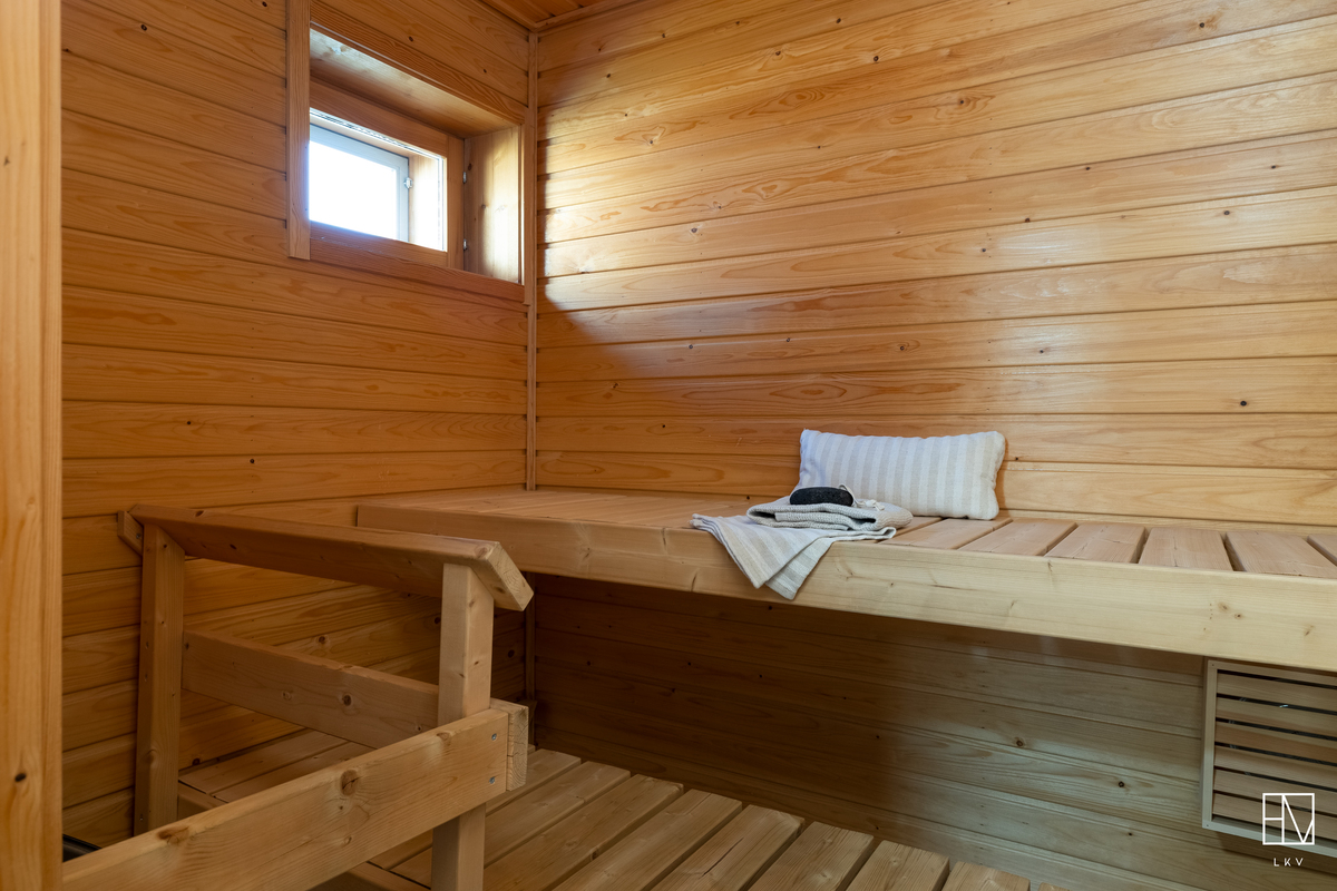 Viihtyisä ja siisti, ikkunallinen saunatila lämpiää Harvian sähkökiukaalla. Lattia on laattaa ja seinät sekä katto puupaneelia.
