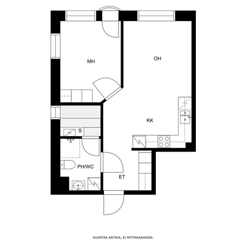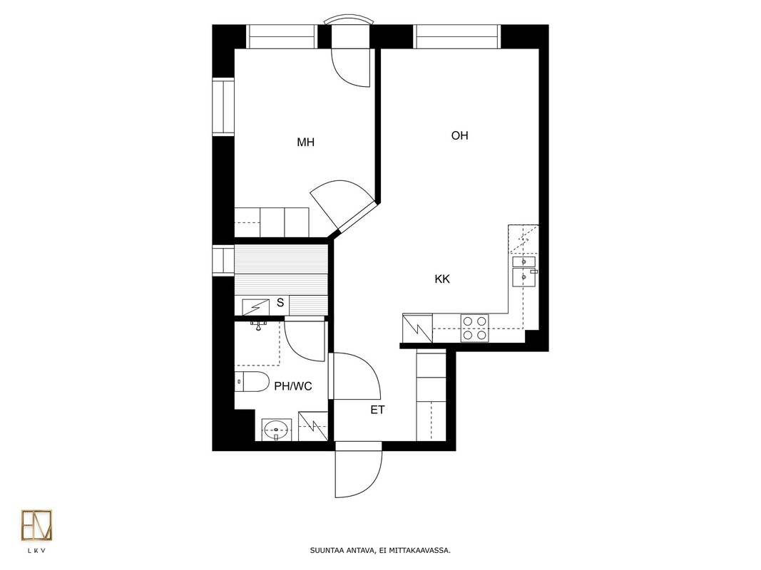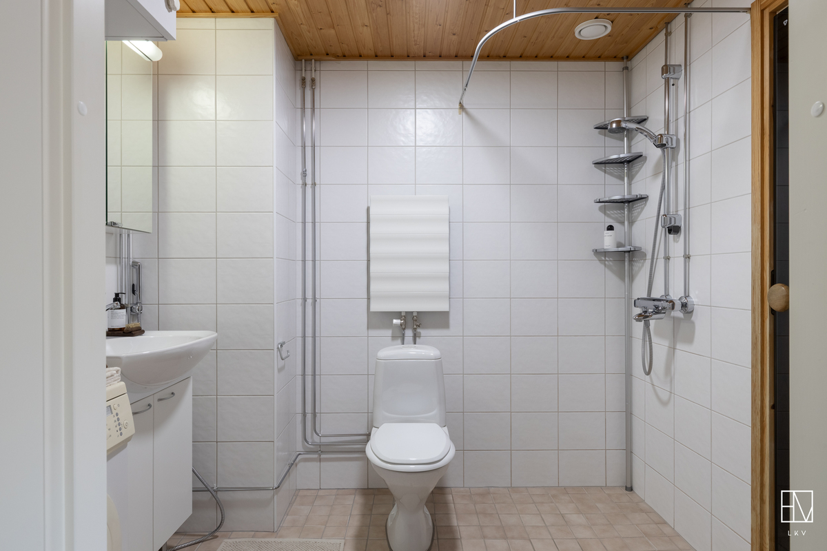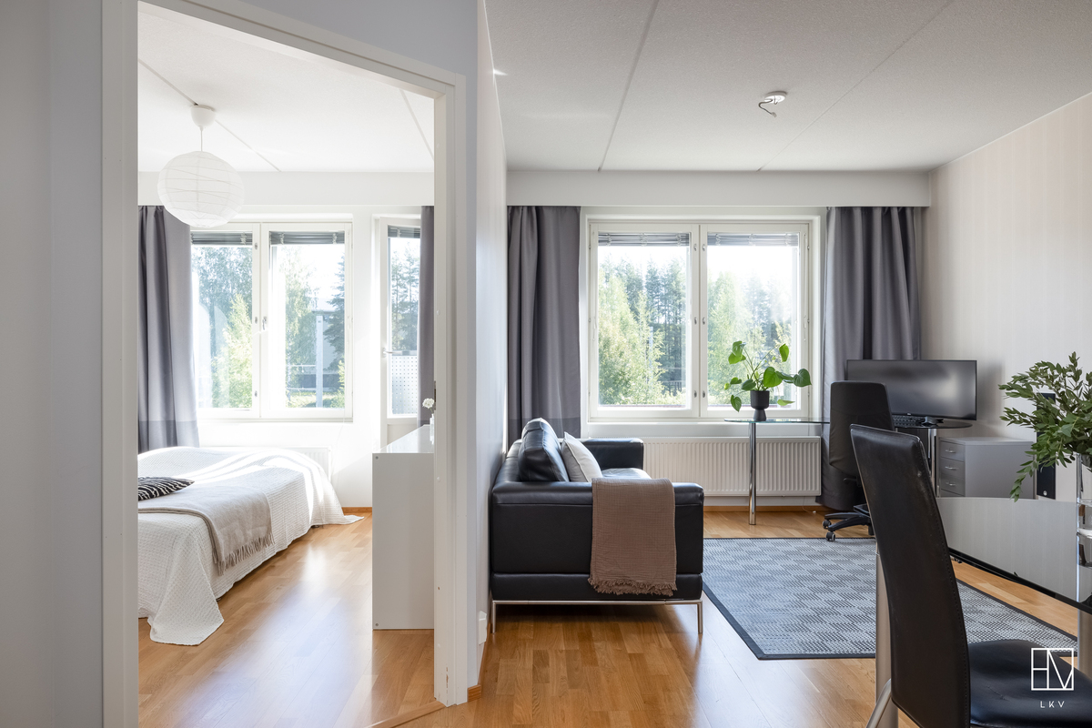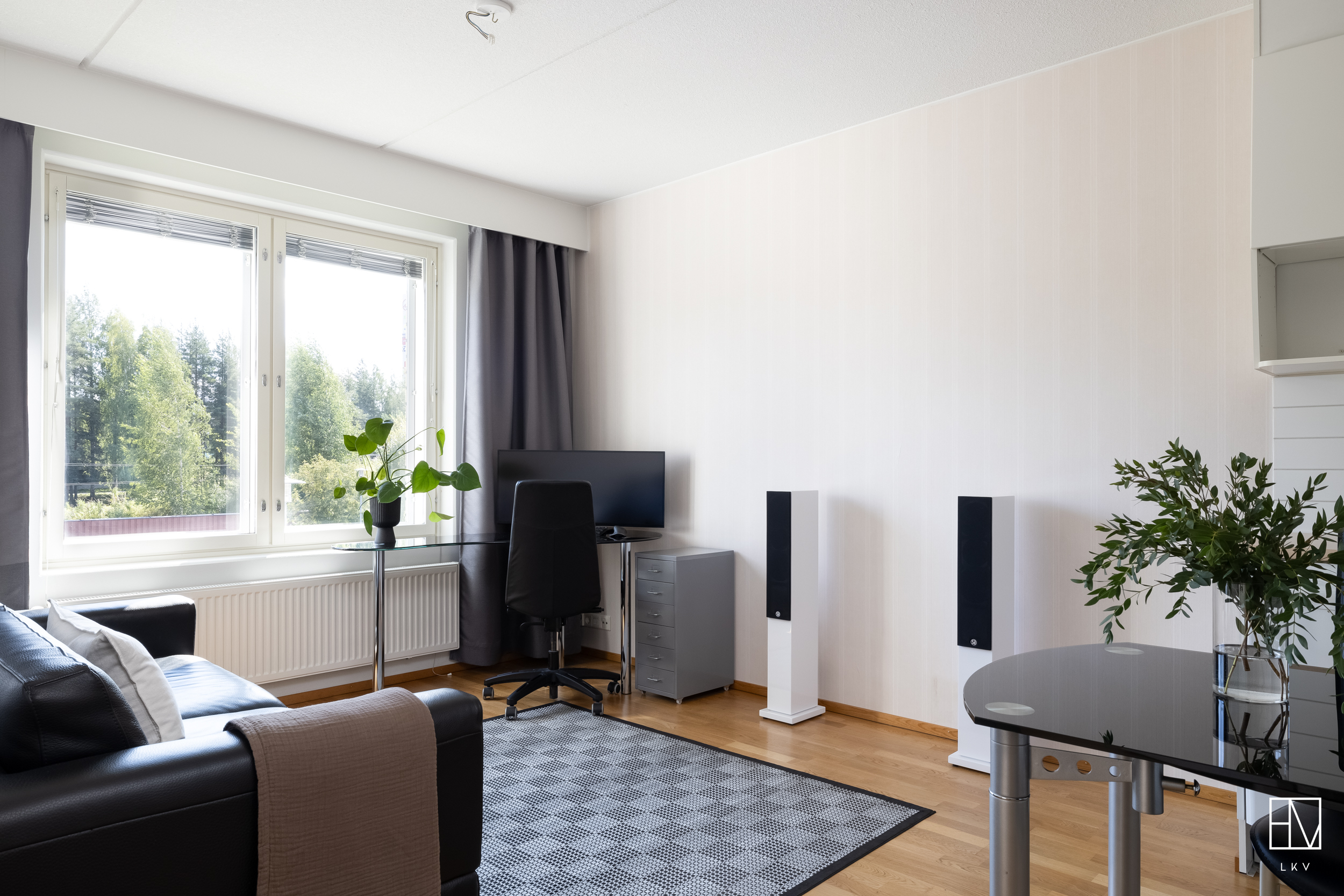 Keittiöstä löytyy kaikki tarvittavat toiminnot. Ruoanlaitolle on reilusti tasotilaa ja myös ruokailuryhmälle on paikkansa. Ihastuttavan valoisassa makuuhuoneessa on ranskalainen parveke, sekä ikkunoita kahteen suuntaan. Säilytystilaa on hyvin makuuhuoneen ja eteisen kaapistoissa. Wc/kylpyhuonetilassa on paikka pesutornille ja omassa saunassa saa nauttia kuumista löylyistä iltojen viiletessä.