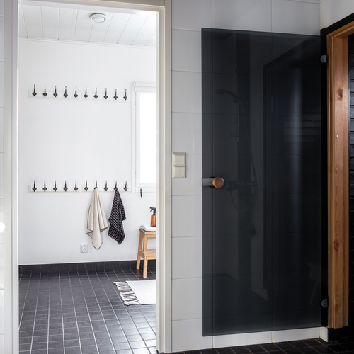 Kylpyhuoneessa seinät ja lattia laattaa. Suihku, wc-istuin, pesuallas ja peilikaappi.