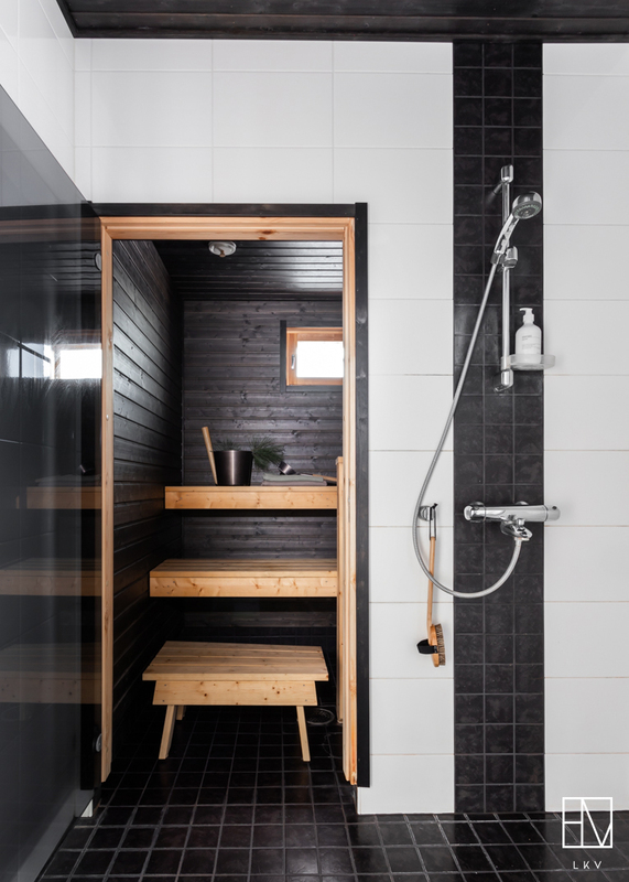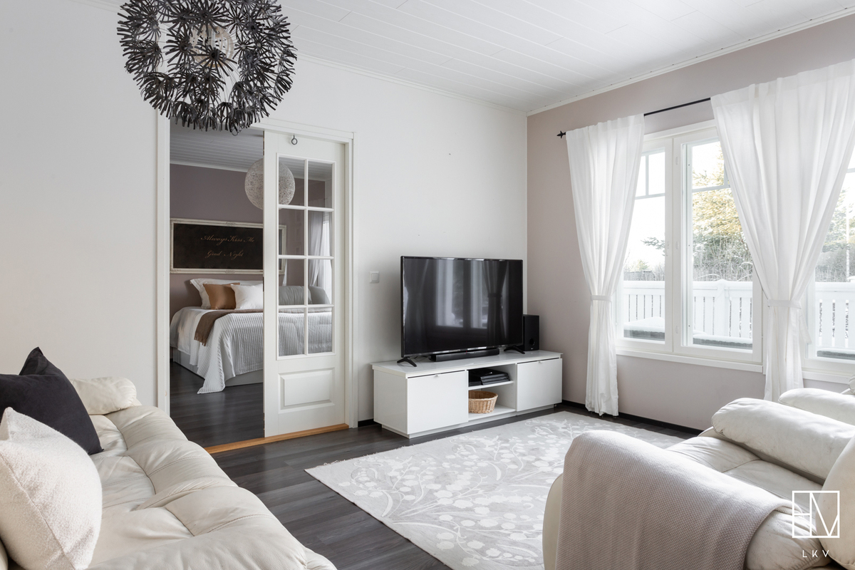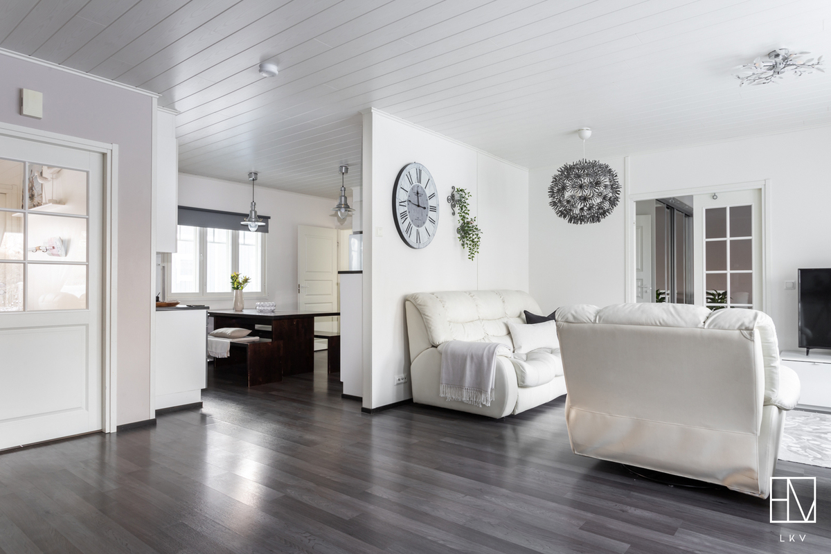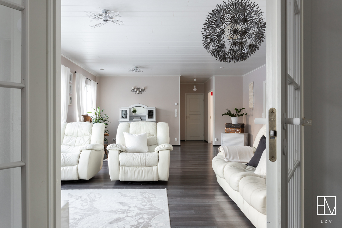 Olohuone on tilava ja siinä onkin alunperin ollut varaus vielä yhdelle ylimääräiselle huoneelle. Olohuoneesta on käynti myös aurinkoiselle takapihalle ja terassille. Keittiössä on tilaa myös ruokapöydälle. Keittiön vieressä on kodinhoitohuone, josta on myös käynti ulos. Asunnossa on kaksi vessaa. Toinen on kylpyhuoneen yhteydessä. Sen yhteydessä on myös sauna. Erillinen wc on lähellä makuuhuoneita. Makuuhuoneita on yhteensä kolme. Talon yläkertaan on jätetty varaus, missä alkuperäisessä suunnitelmassa on kaksi makuuhuonetta lisää.