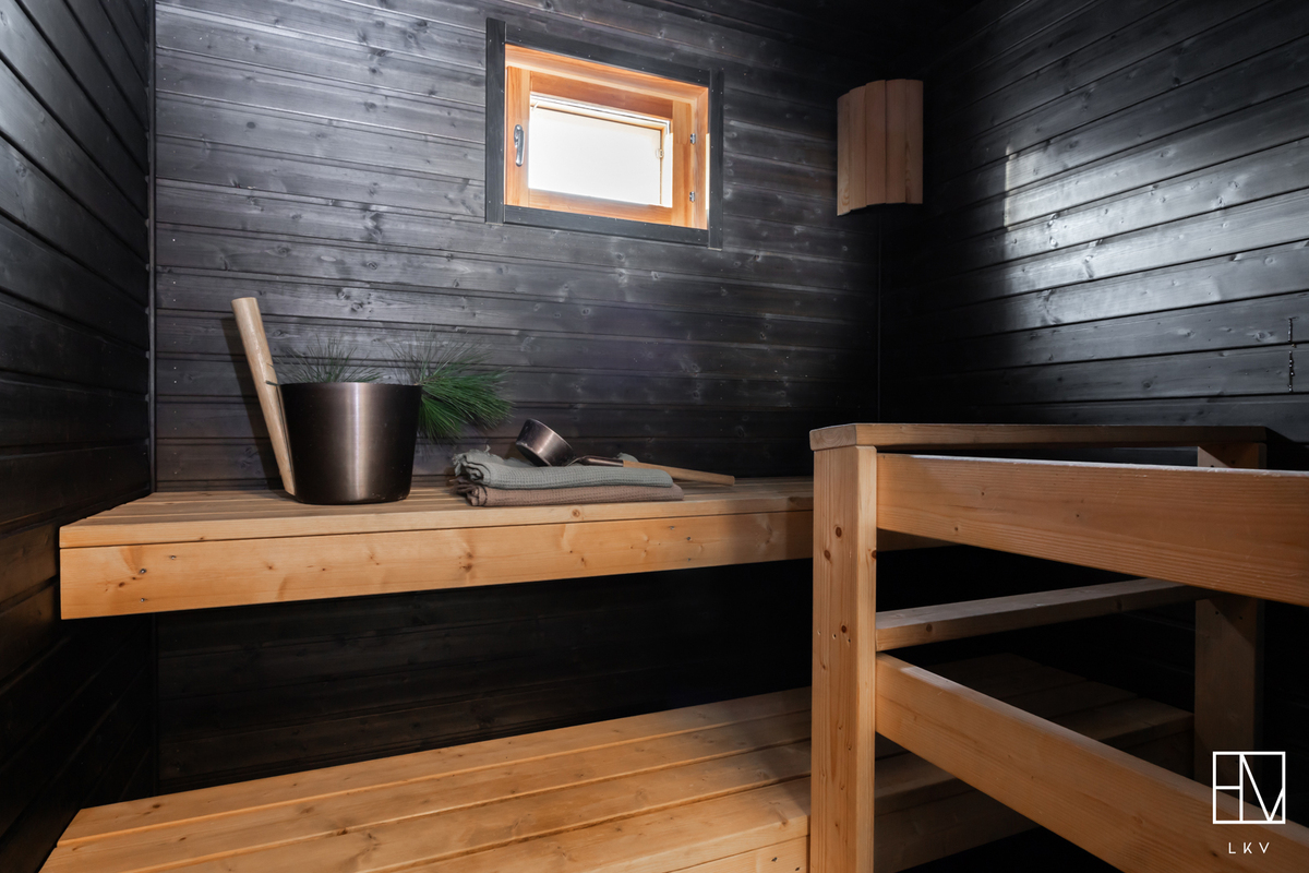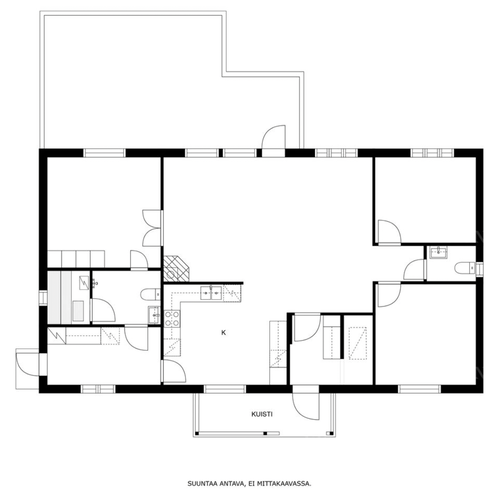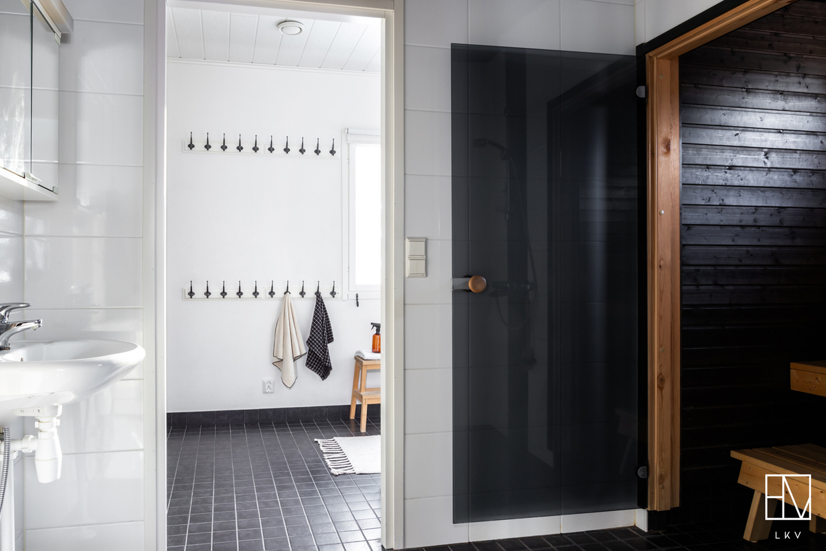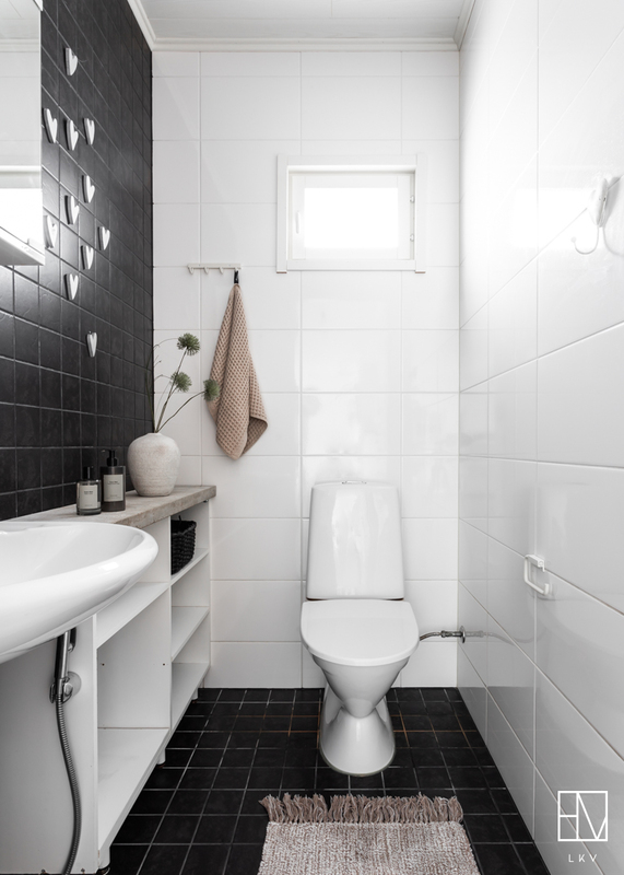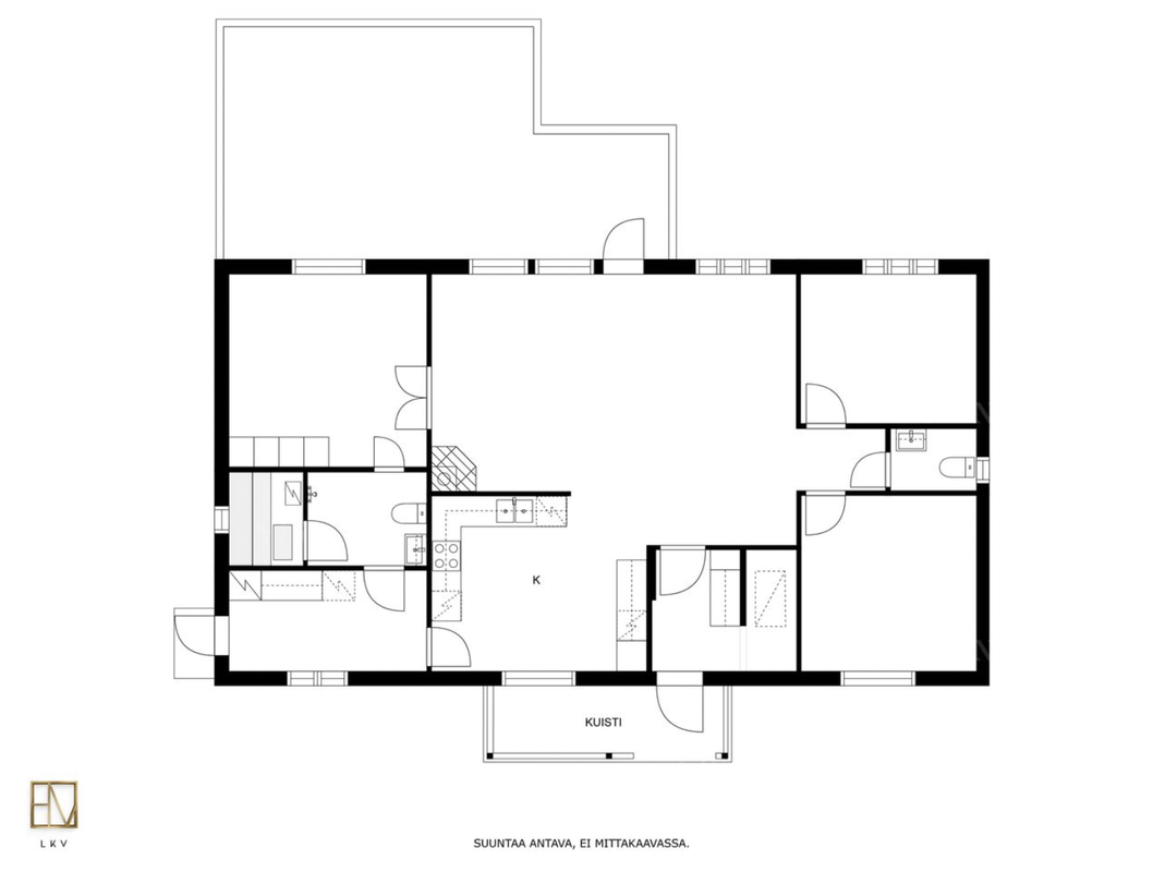 Olohuone on tilava ja siinä onkin alunperin ollut varaus vielä yhdelle ylimääräiselle huoneelle. Olohuoneesta on käynti myös aurinkoiselle takapihalle ja terassille. Keittiössä on tilaa myös ruokapöydälle. Keittiön vieressä on kodinhoitohuone, josta on myös käynti ulos. Asunnossa on kaksi vessaa. Toinen on kylpyhuoneen yhteydessä. Sen yhteydessä on myös sauna. Erillinen wc on lähellä makuuhuoneita. Makuuhuoneita on yhteensä kolme. Talon yläkertaan on jätetty varaus, missä alkuperäisessä suunnitelmassa on kaksi makuuhuonetta lisää.