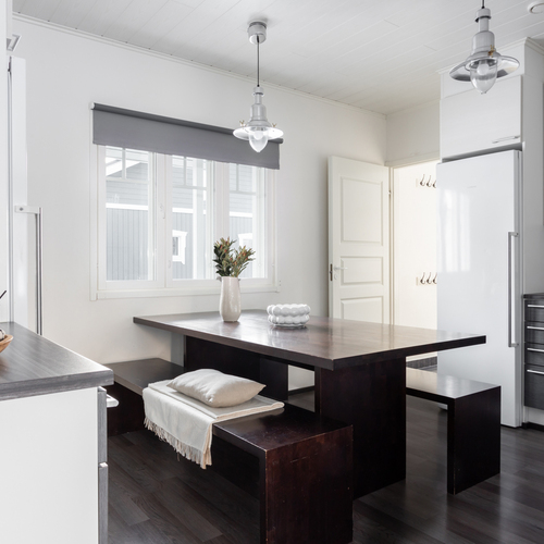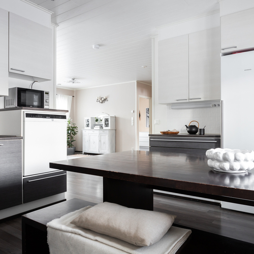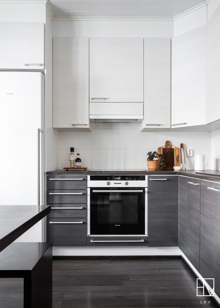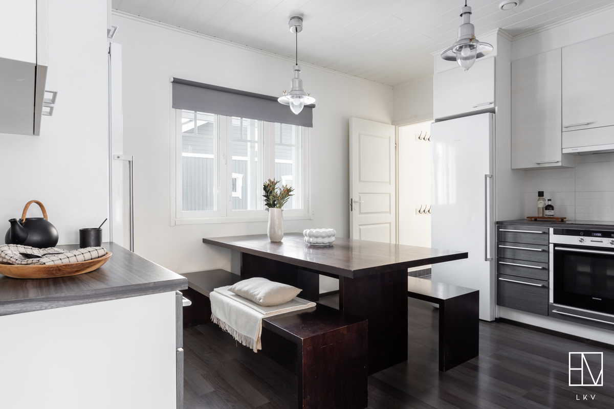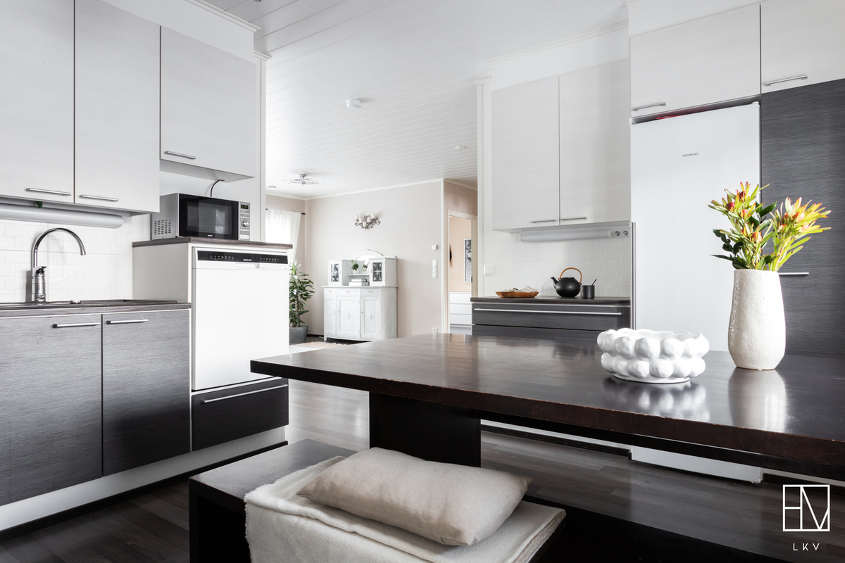 Tilavaan keittiöön mahtuu hyvin myös ruokapöytä. Runsaasti kaappi- ja laskutilaa.
