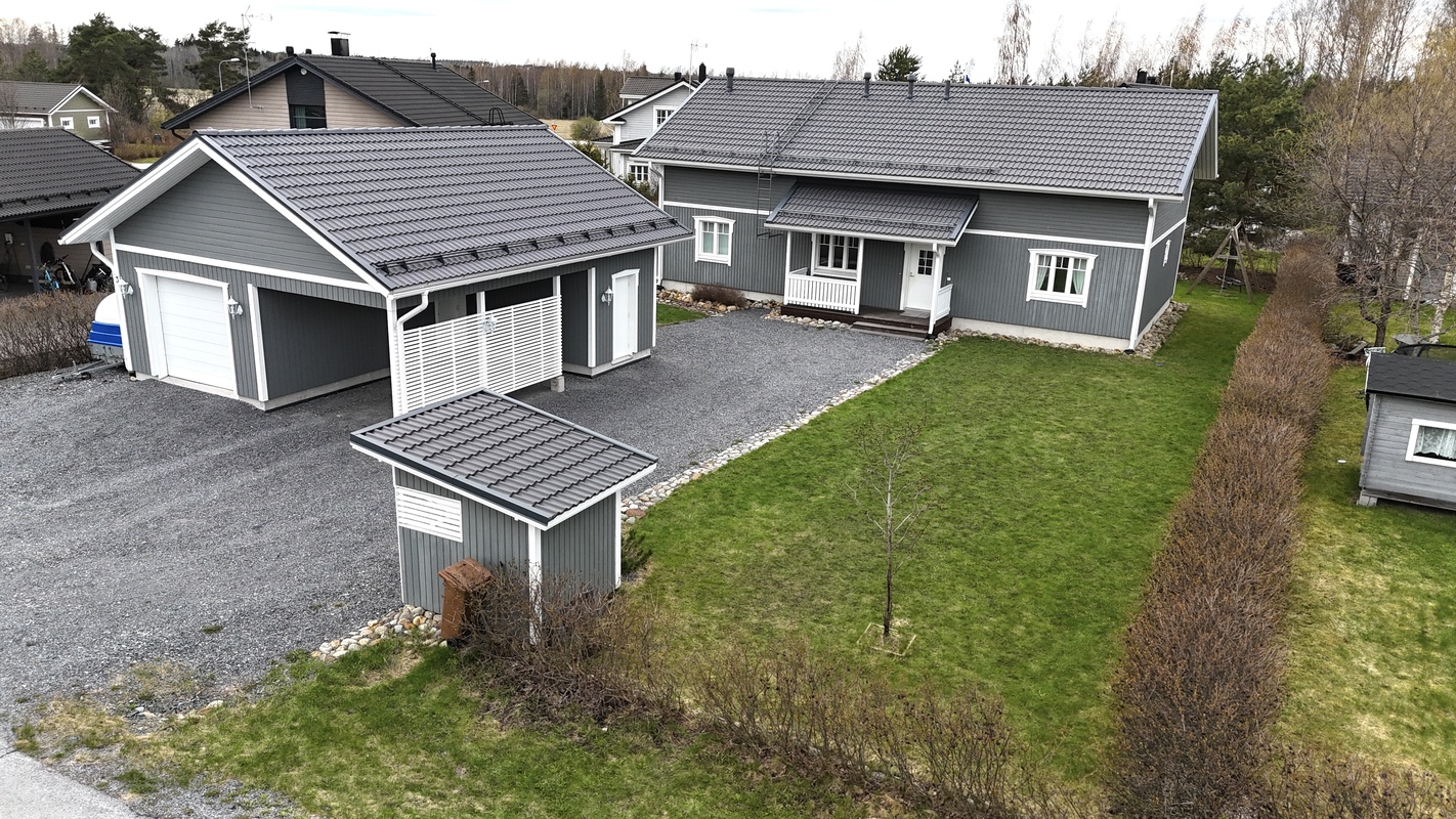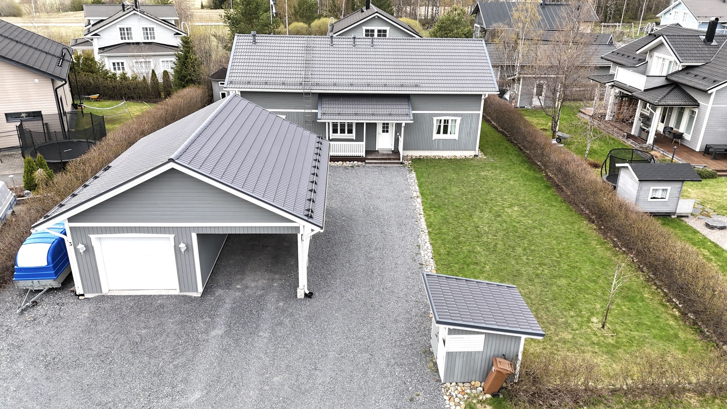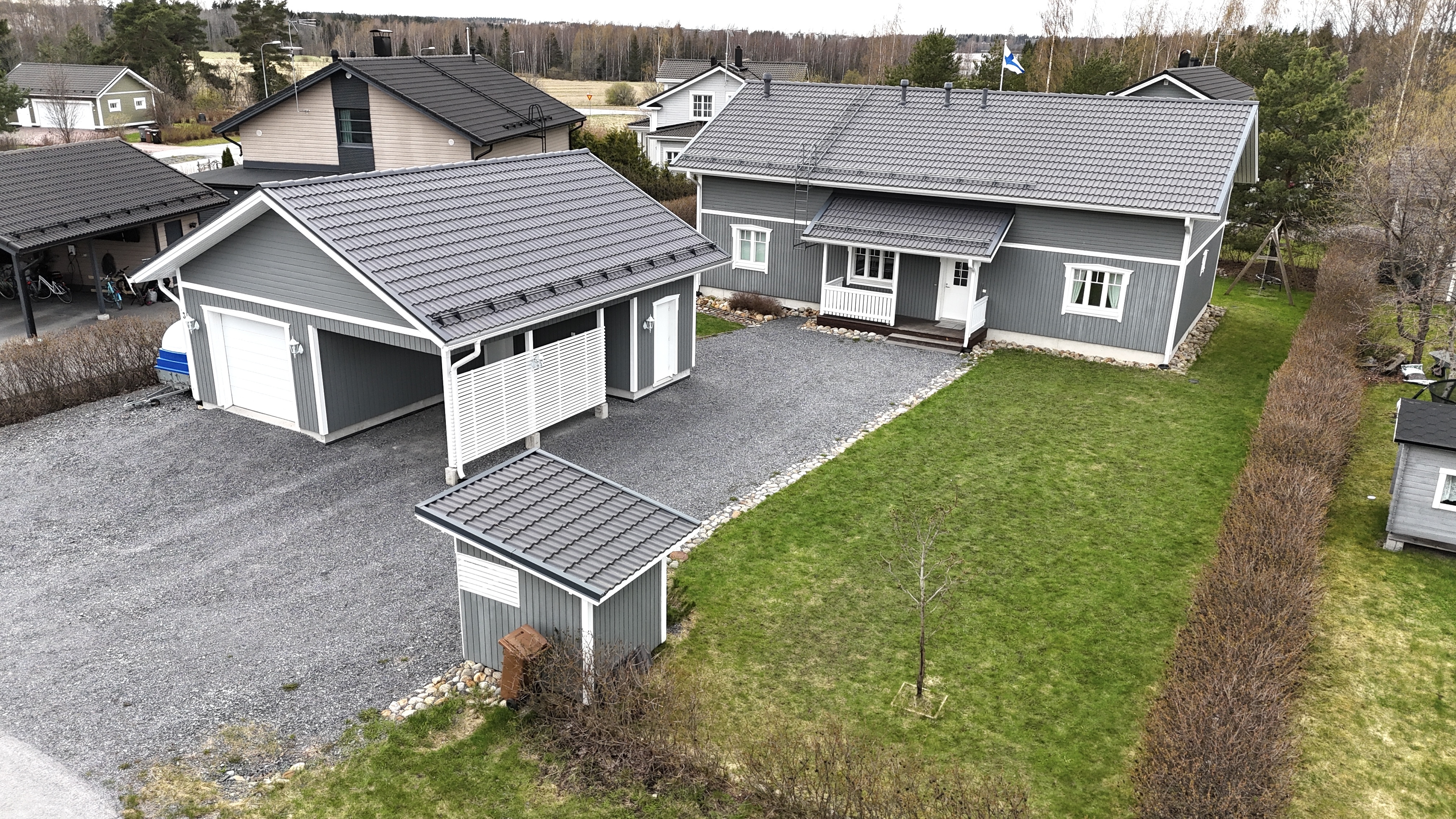 Tilavalla pihalla mahtuu hyvin pelaamaan vaikka jalkapalloa. Pihalta löytyy myös leikkimökki ja autotalli varastolla sekä autokatoksella. Tontti on vuokrattu, mutta se on myös lunastettavissa. Talossa on vesikiertoinen lattialämmitys.
