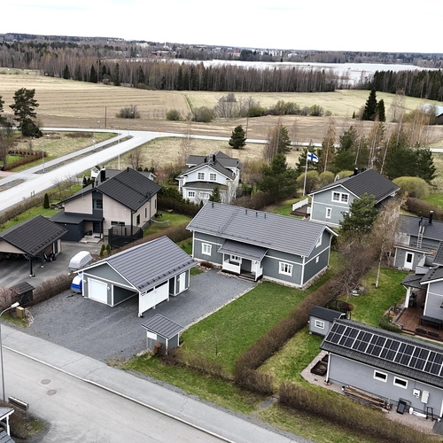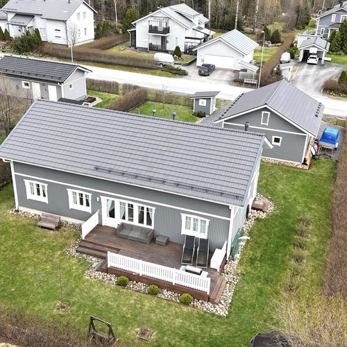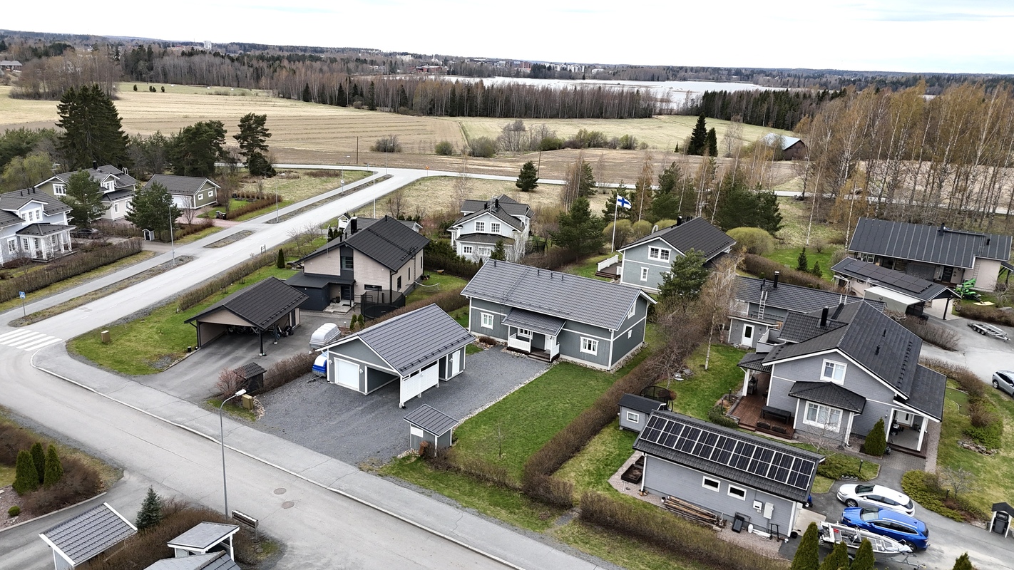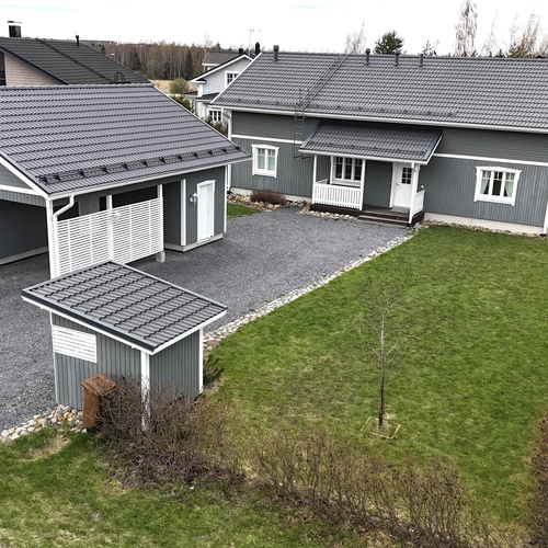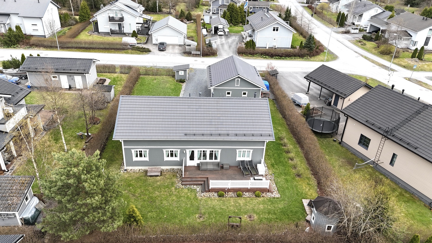 Tilavalla pihalla mahtuu hyvin pelaamaan vaikka jalkapalloa. Pihalta löytyy myös leikkimökki ja autotalli varastolla sekä autokatoksella. Tontti on vuokrattu, mutta se on myös lunastettavissa. Talossa on vesikiertoinen lattialämmitys.