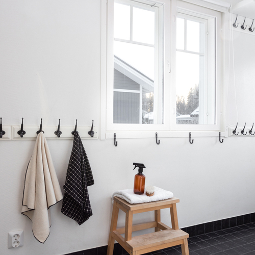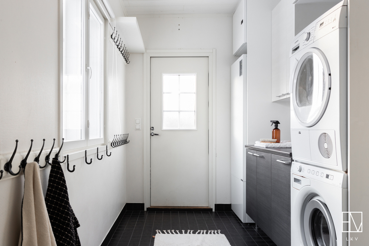 Kodinhoitohuoneesta ovi ulos. Lattia laattaa. Paikka pesutornille, varaus pesualtaalle, taso ja kaappitilaa.