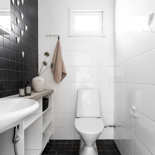 Erillisessä asunnon toisessa wc:ssä seinät ja lattia laatta. Wc-istuin, bidee, peilikaappi, pesuallas ja allaskaappi.