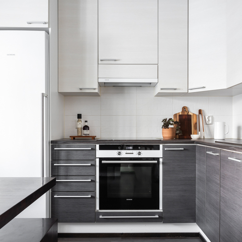 Täyskorkeat jääkaappi ja pakastin, erillisuuni, induktioliesi, liesituuletin, astianpesukone.