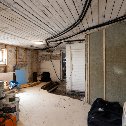 Kellarikerroksessa: asennettu uusi viemäriputki teknistä tilaa kohti (tulevaisuuden saunasuunnitelmia ajatellen), tehty sähkö- ja valoasennuksia.