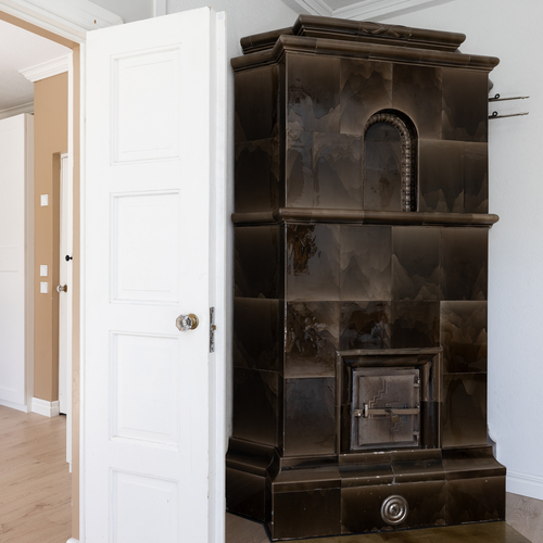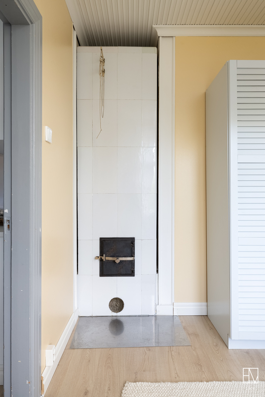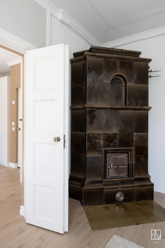 Olohuoneesta löytyy upea varaava kaakeliuuni.