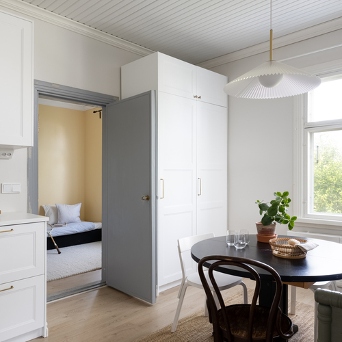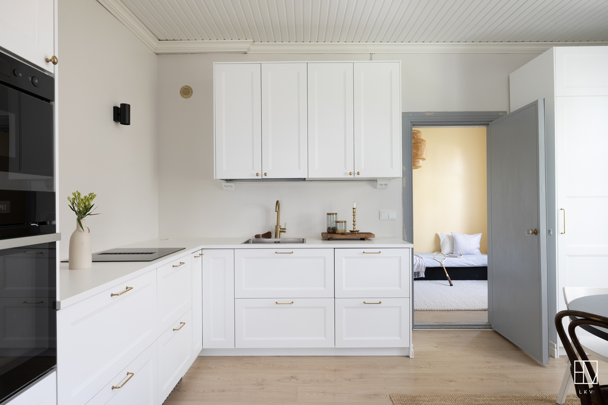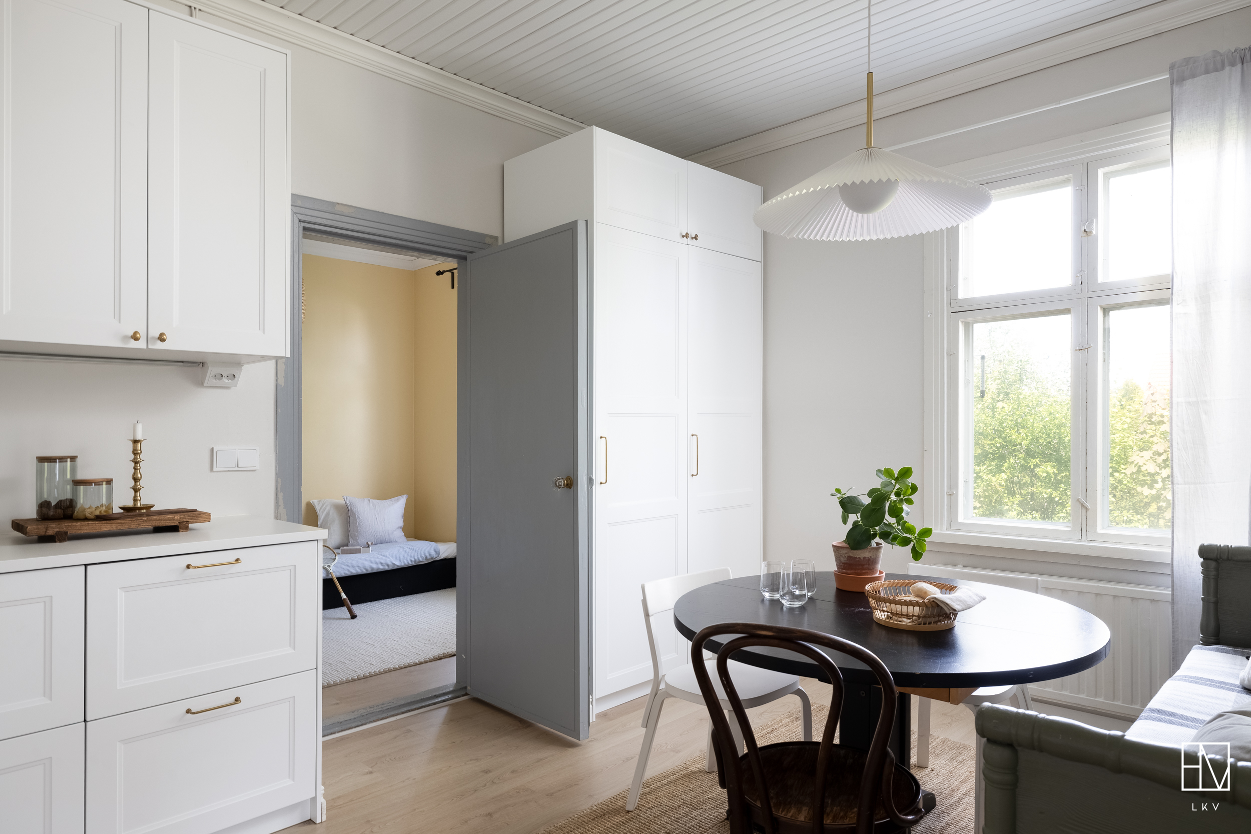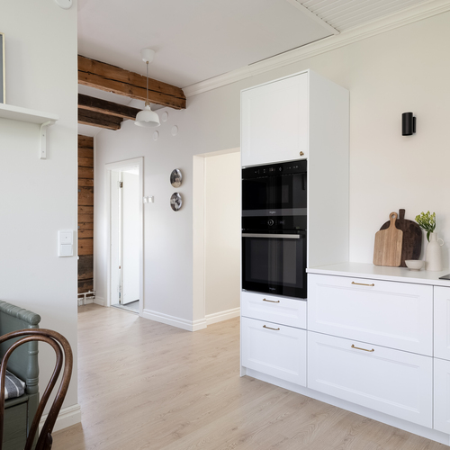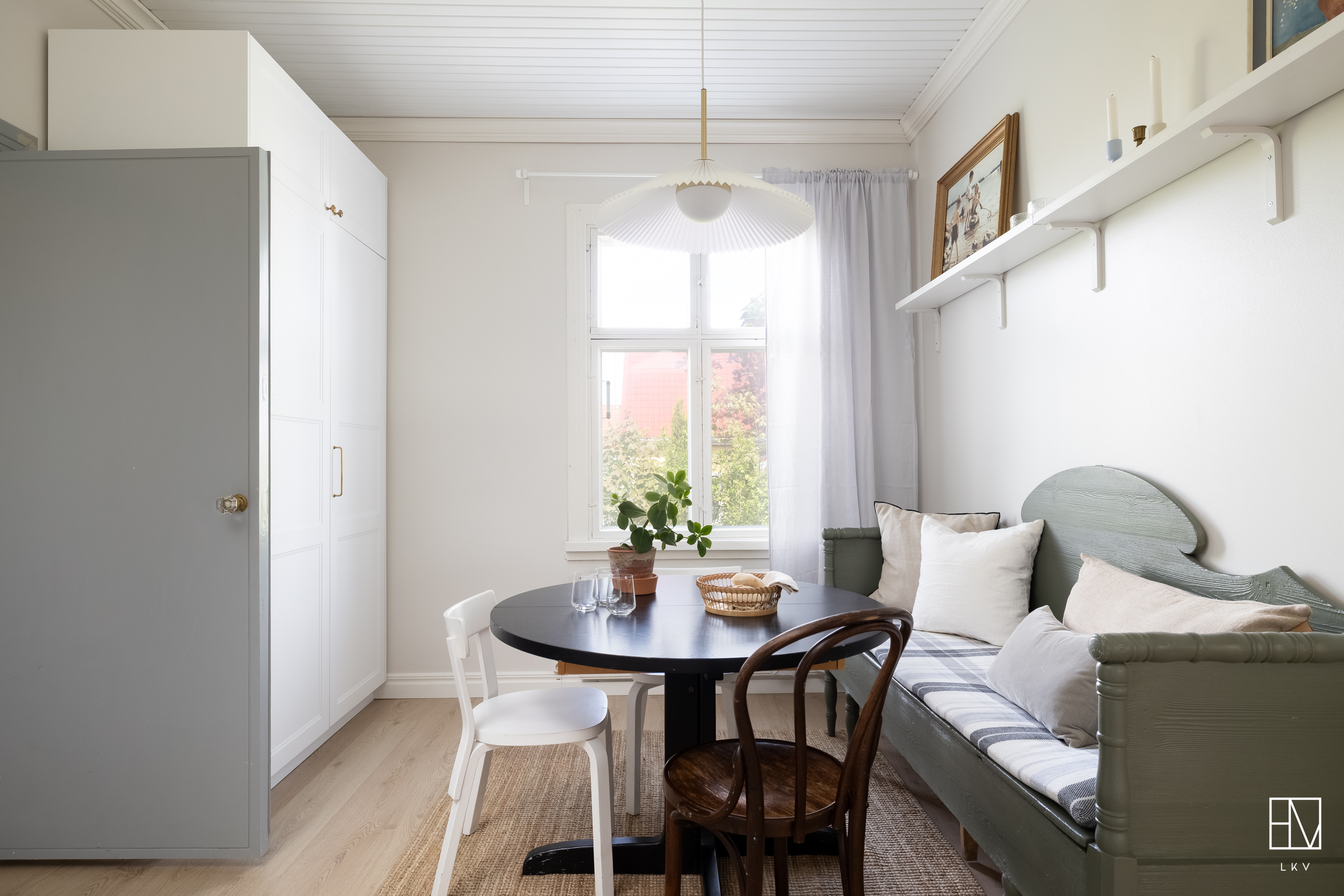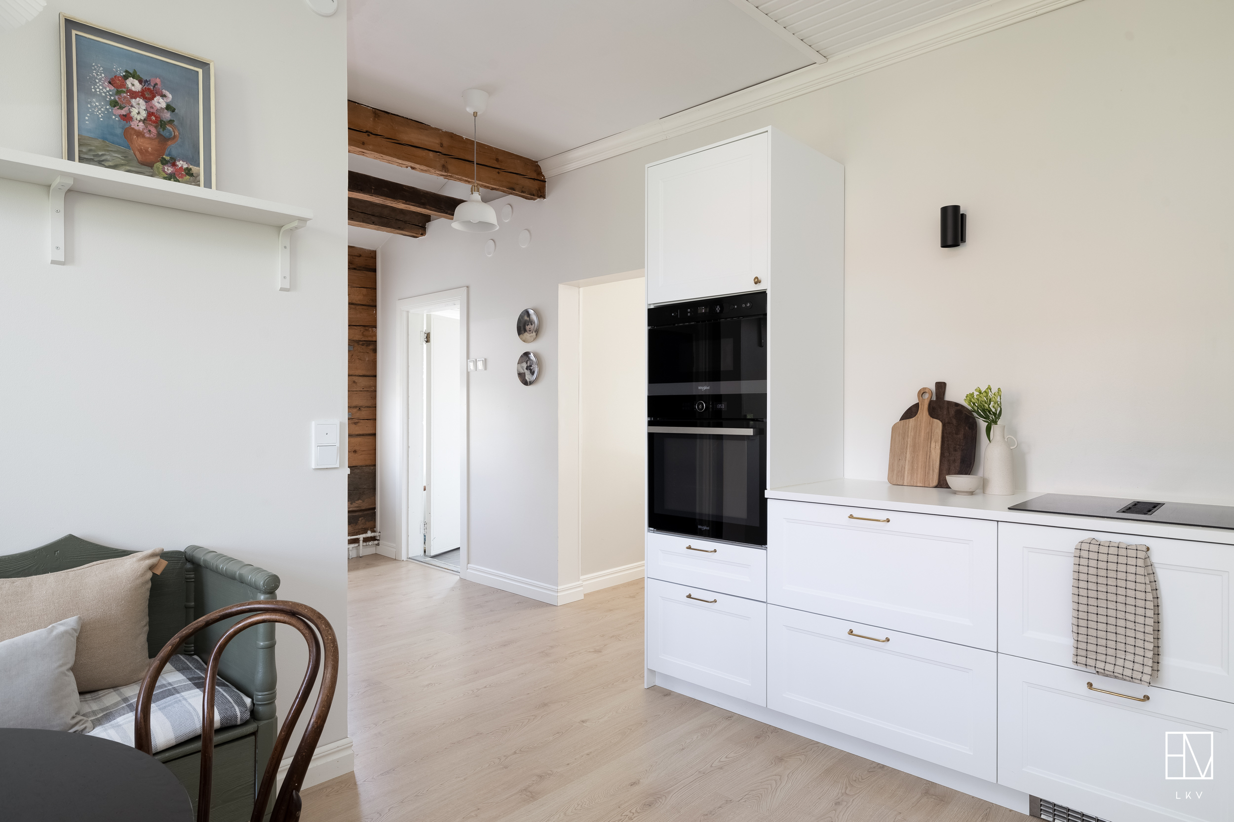 Tämän omatonttisen kodin asuintiloja on remontoitu laajasti. Vuonna 1932 valmistuneen hirsitalon vaaleaa keittiö on harkittu ja tyylikäs kokonaisuus, joka kutsuu perheen yhteisiin ruokailuhetkiin. Keittiötilaa on uudistettu vuonna 2022 ja samalla vaihdettu kattavasti kodinkoneita! Samassa yhteydessä on uusittu asuintilojen lattioita ja maalattu seiniä.