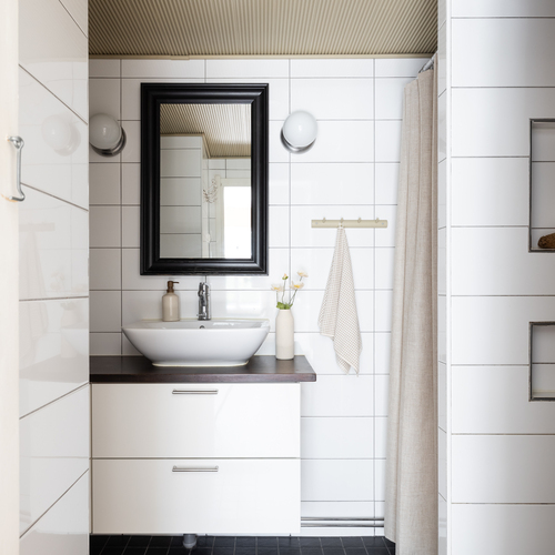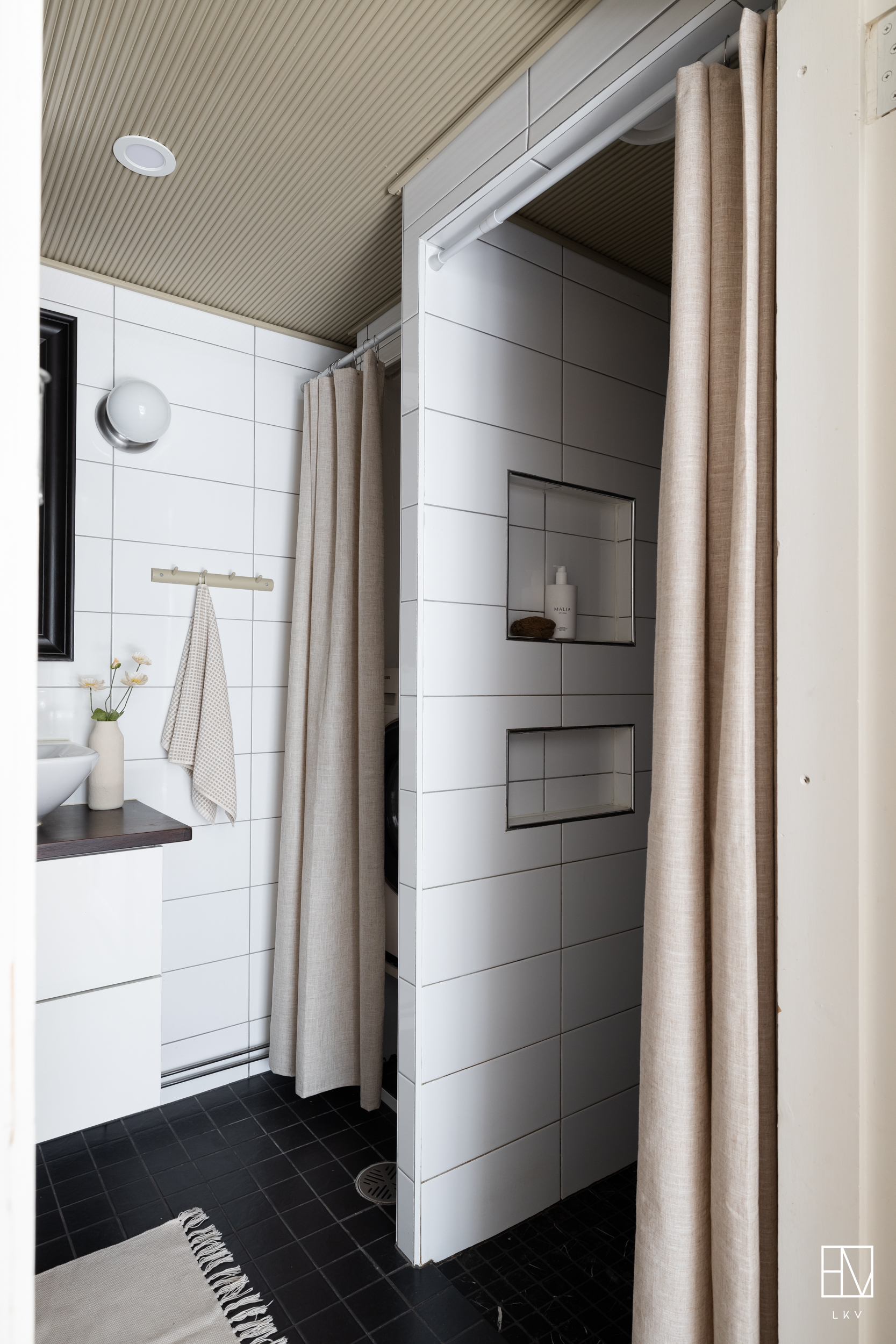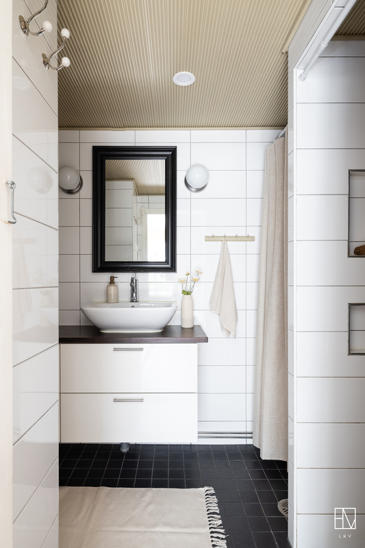 Kylpyhuoneen lattiassa on laatta ja seinissä kaakeli. Kattoon on asennettu ihastuttava sormipaneeli. Pesualtaan yhteydessä on allaskaappi kahdella laatikostolla, sekä peili ja kiinteäasti asennetut seinävalaisimet. Tilassa on lisäksi sähkökäyttöinen lattialämmitys ja tehostettu ilmanvaihto.