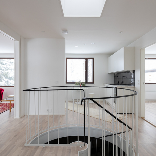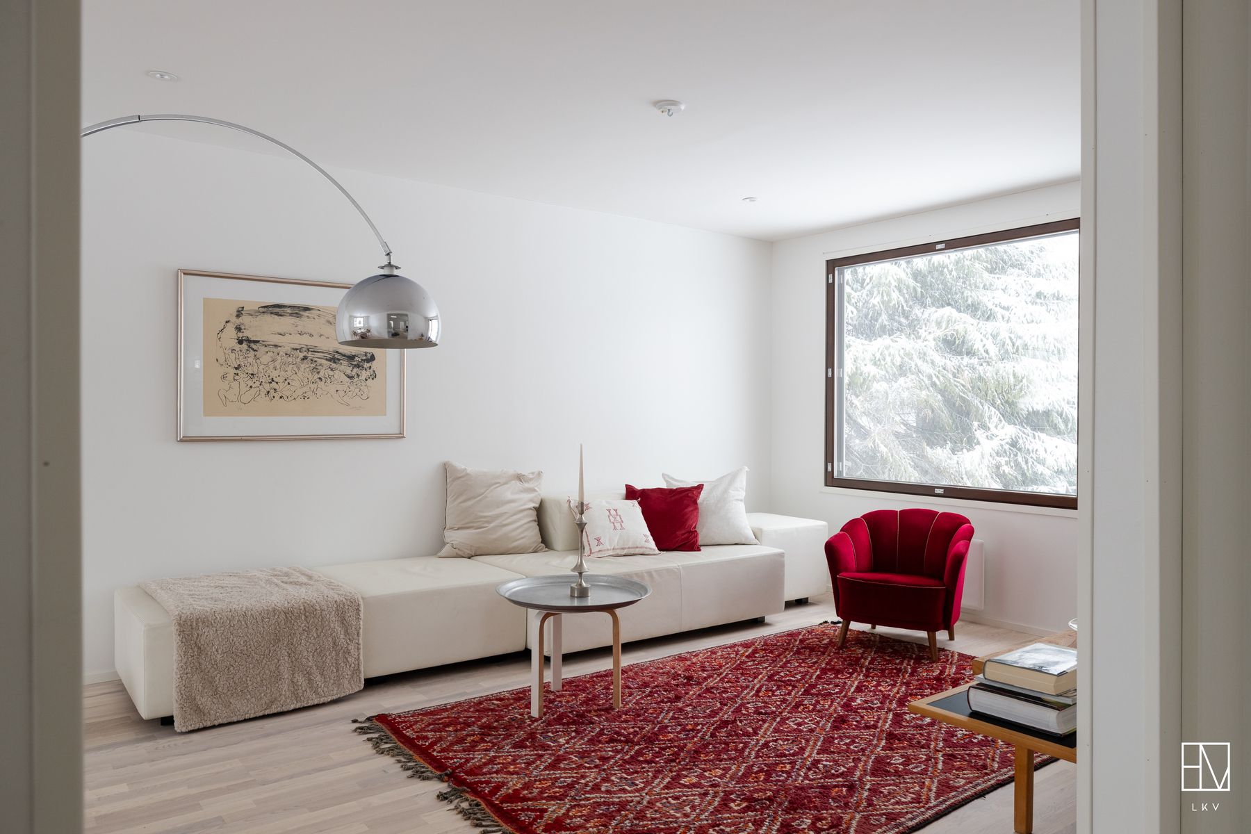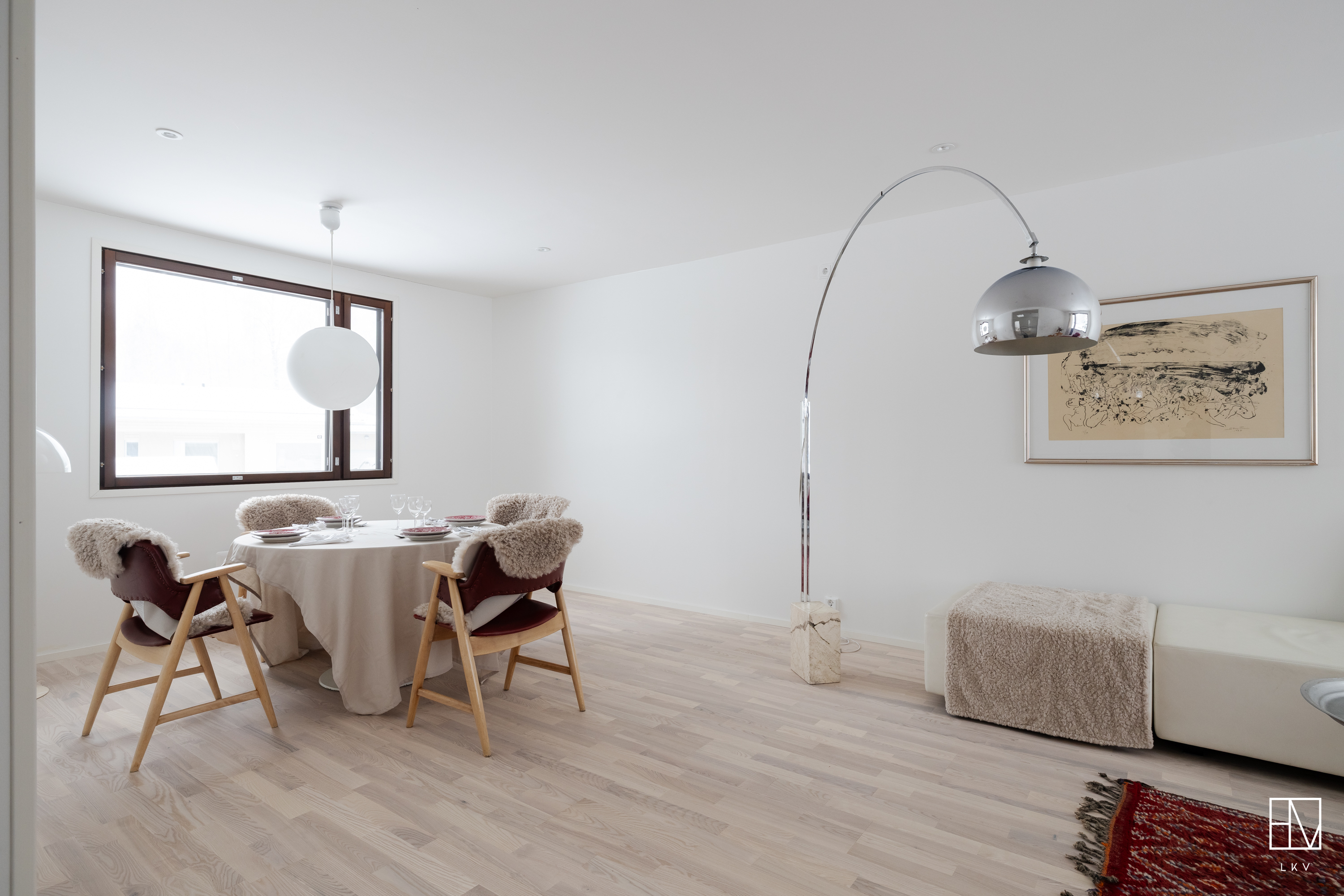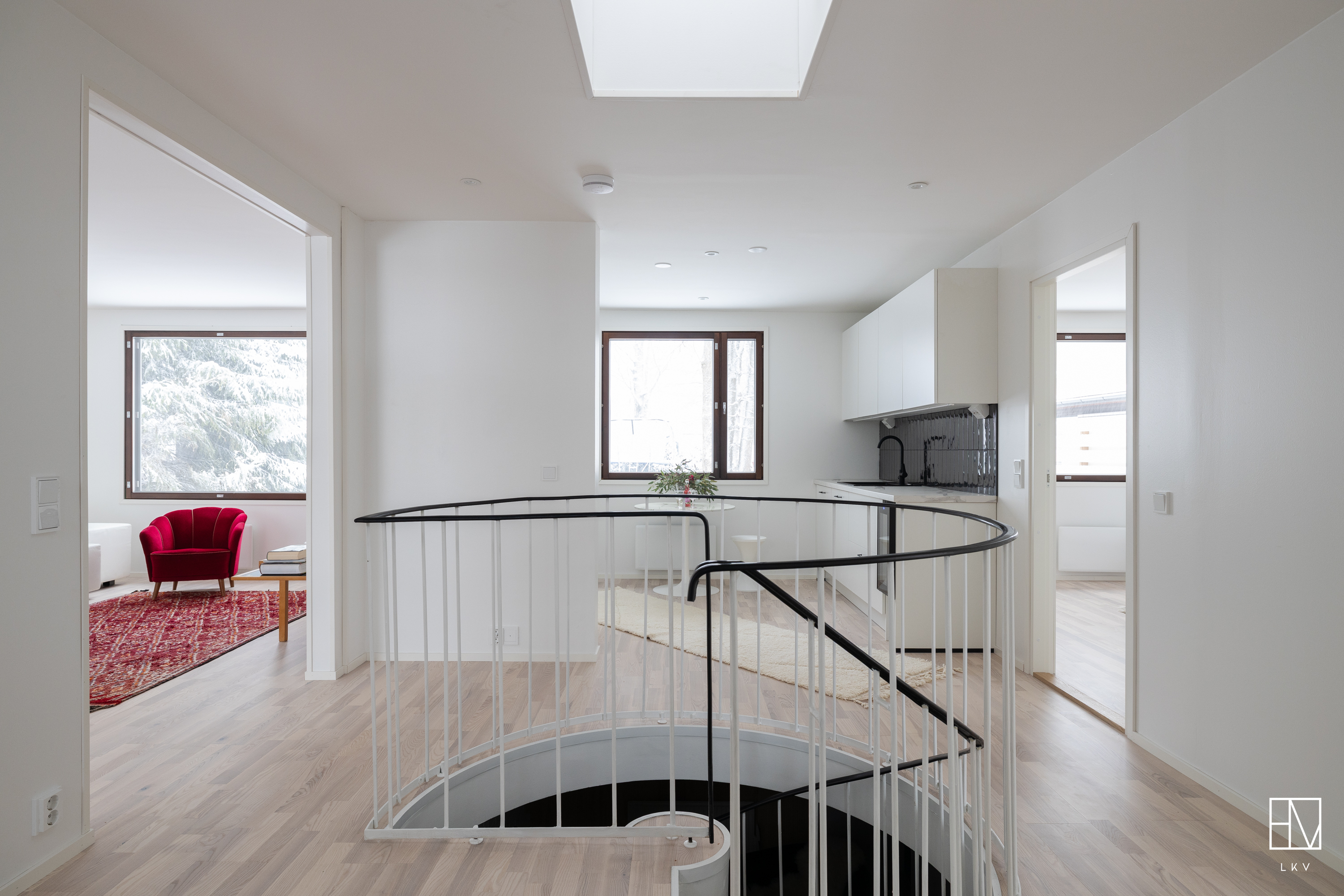 Sisääntultaessa huomio kiinnittyy keskellä asuntoa olevaan näyttävään kierreportaaseen. Kierreportaan vasemmalla puolella on tilava olohuoneen ja ruokailutilan yhdistelmä, peräti noin 30 m² avara tila. Tilaa pystyy myös jakamaan, mikäli tulee tarvetta lisähuoneille. Tämä on otettu sähköistyksessäkin jo huomioon. Olohuoneesta on käynti terassille, joka kiertyy asunnon kahdelle sivulle. Päädyssä olevaa terassin osaa voisi kutsua aurinkoterassiksi. Uudessa Noblessan keittiössä on runsaat varusteet, viinikaappia myöden. Sisääntulokerroksessa on olohuone, ruokailutila, kaksi makuuhuonetta ja vaatehuone sekä wc. Remontissa on myös yläkerran seinät eristetty uudelleen, ja vaihdettu energiatehokkaammat sähkölämmityspatterit. Myös ilmalämpöpumppu on juuri asennettu!