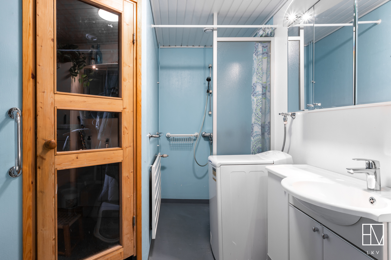 Varusteet: suihkuseinä, pesukoneliitäntä, wc-istuin, suihku, peilikaappi