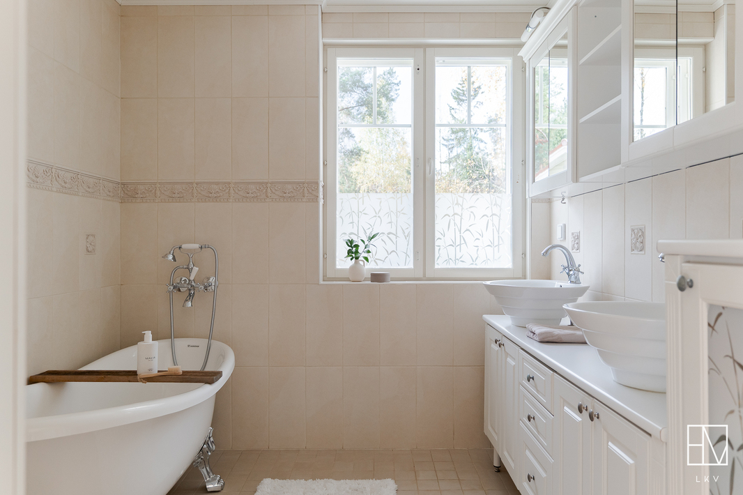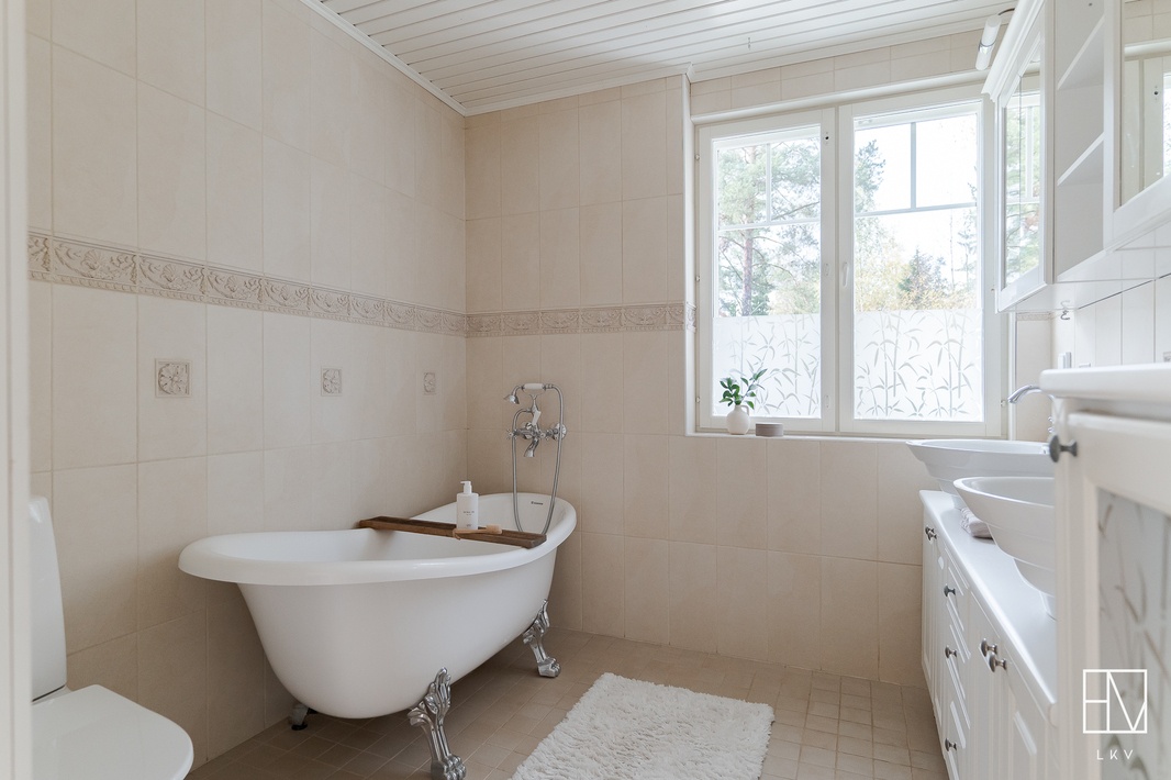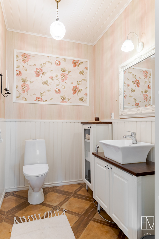 | WC-tilojen kuvaus | Allaskaapisto. Päärakennuksessa erillinen wc sekä isoimman makuuhuoneen yhteydessä kylpyhuone, jossa on upea tassuamme ja kaksi allasta. Myös pihasaunassa on wc. |