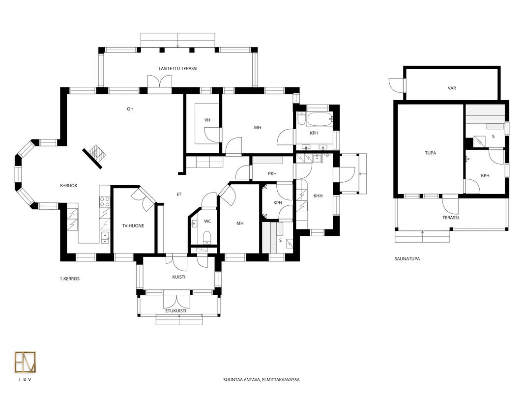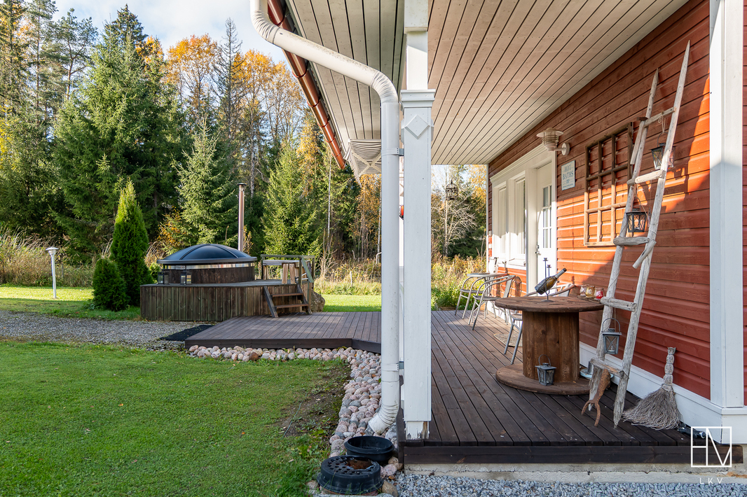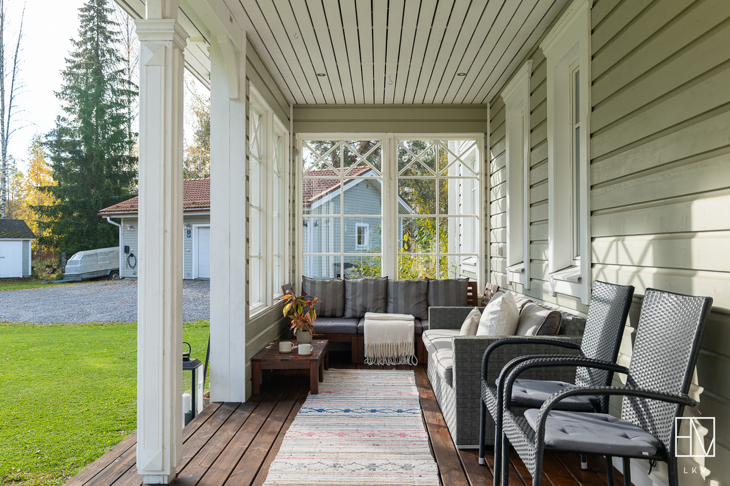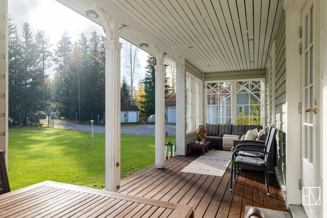 | Pinta-alojen lisätiedot | Pinta-aloja ei ole tarkistusmitattu. Pinta-ala voi siis olla edellä mainittua pienempi tai suurempi. HInta ei ole pinta-alaperusteinen vaan perustuu kokonaisuuteen. Leimattujen lupakuvien mukaan neliöt ovat seuraavat: Päärakennuksen kerrosala 191 m2, huoneistola 169 m2. Autotallirakennuksen kerrosala 70 m2 (talli 46,2 m2 ja varasto 16,3 m2), saunarakennuksen kerrosala 41 m2 (tupa 16,8 m2, pesuhuone 5,0 m2 ja sauna 4,6 m2). Lisäksi saunarakennuksessa puuvarasto 8,2 m2. Muita tiloja ovat autotallirakennus, saunarakennus sekä puuvarasto. Muiden tilojen pinta-alat ovat ilmoitettu kerrosaloina eli huoneistoala on hieman mainittua pienempi. |