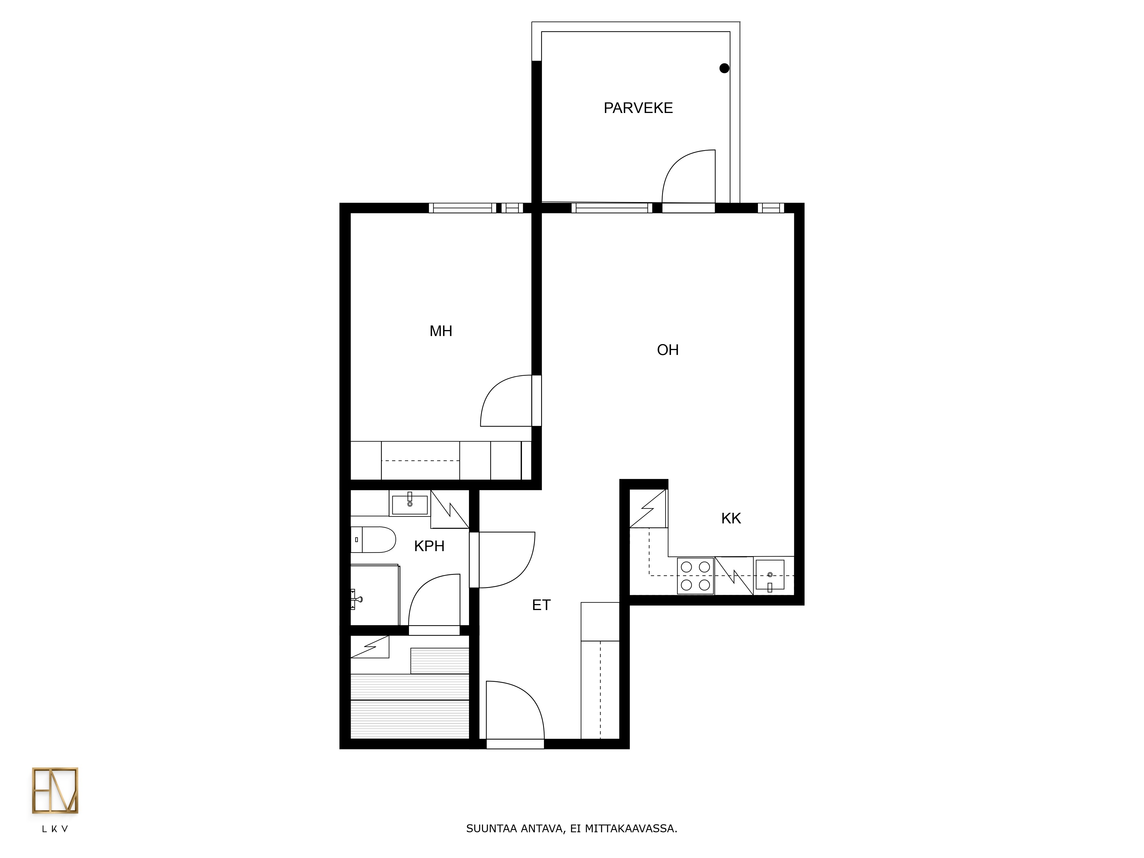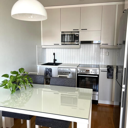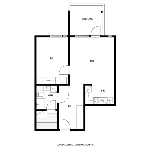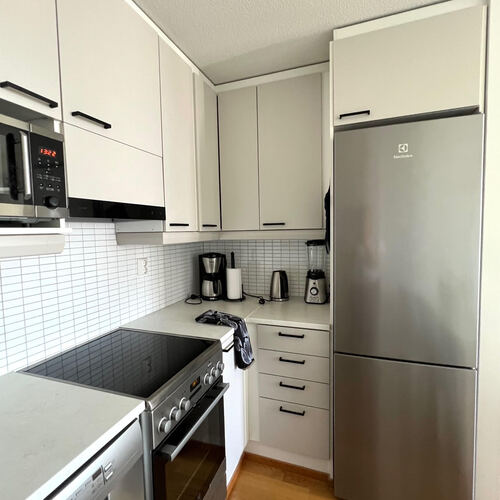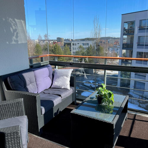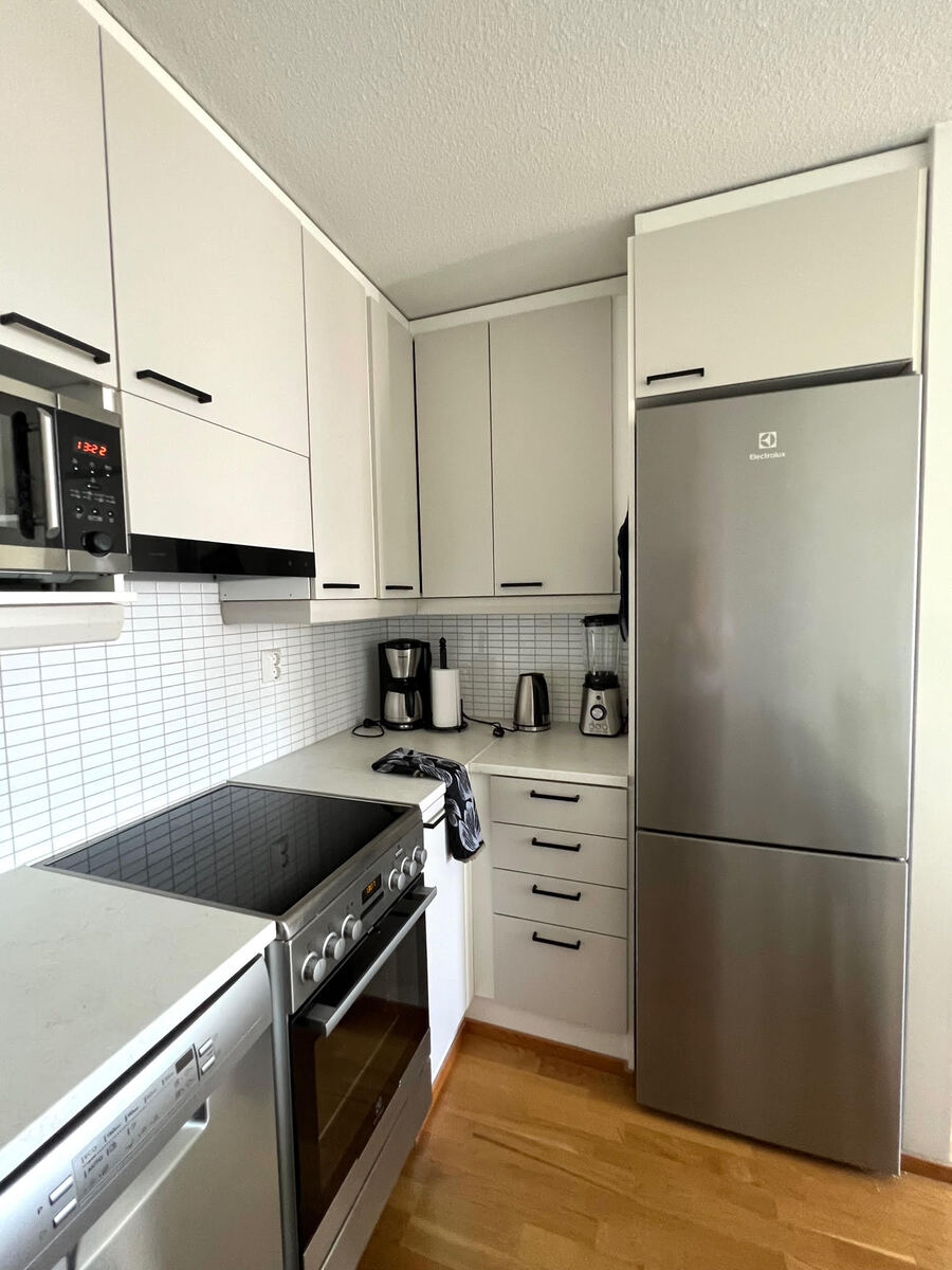 Kompakti kokonaisuus jossa nykyaikainen keittiö yhdistyy valoisaan olohuoneeseen josta käynti lasitetulle parvekkeelle. Kylpyhuone on siisti kokonaisuus jonne mahtuu myös pesukone.